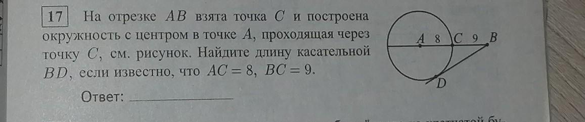 Построим отрезок AD. Длина отрезка AD=r - радиусу т.е. 8 см, как отрезок, проведенный из центра окружности до любой точки на окружности. Имеем трегольник ABD. Причем угол ADB=90 град. т.к. ВД - касательная в т.D, а AD - радиус проведенный в эту же точку. В этом треугольнике известна гипотенуза AB=8+9=17 см, и катет AD=r=8 см. По теореме Пифагора: BD=SQRY(17^2-8^2)=Sqrt(289-64)=Sqrt225=15.