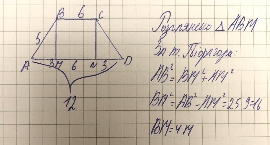 Знайти висоту рівнобічної трапеції, основи якої 6м і 12м, а бічна сторона 5м.