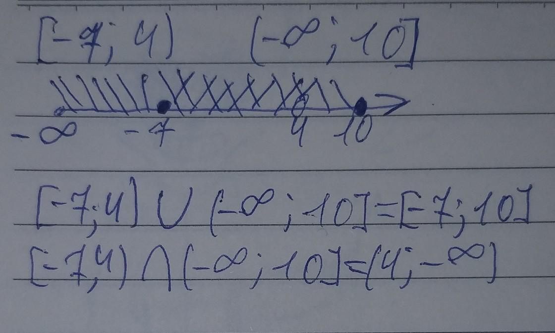 изообразите на координатной прямой и запишите пересечения и объеденения числовых промежутках : [ - 7;4) и (-бесконечность;10]