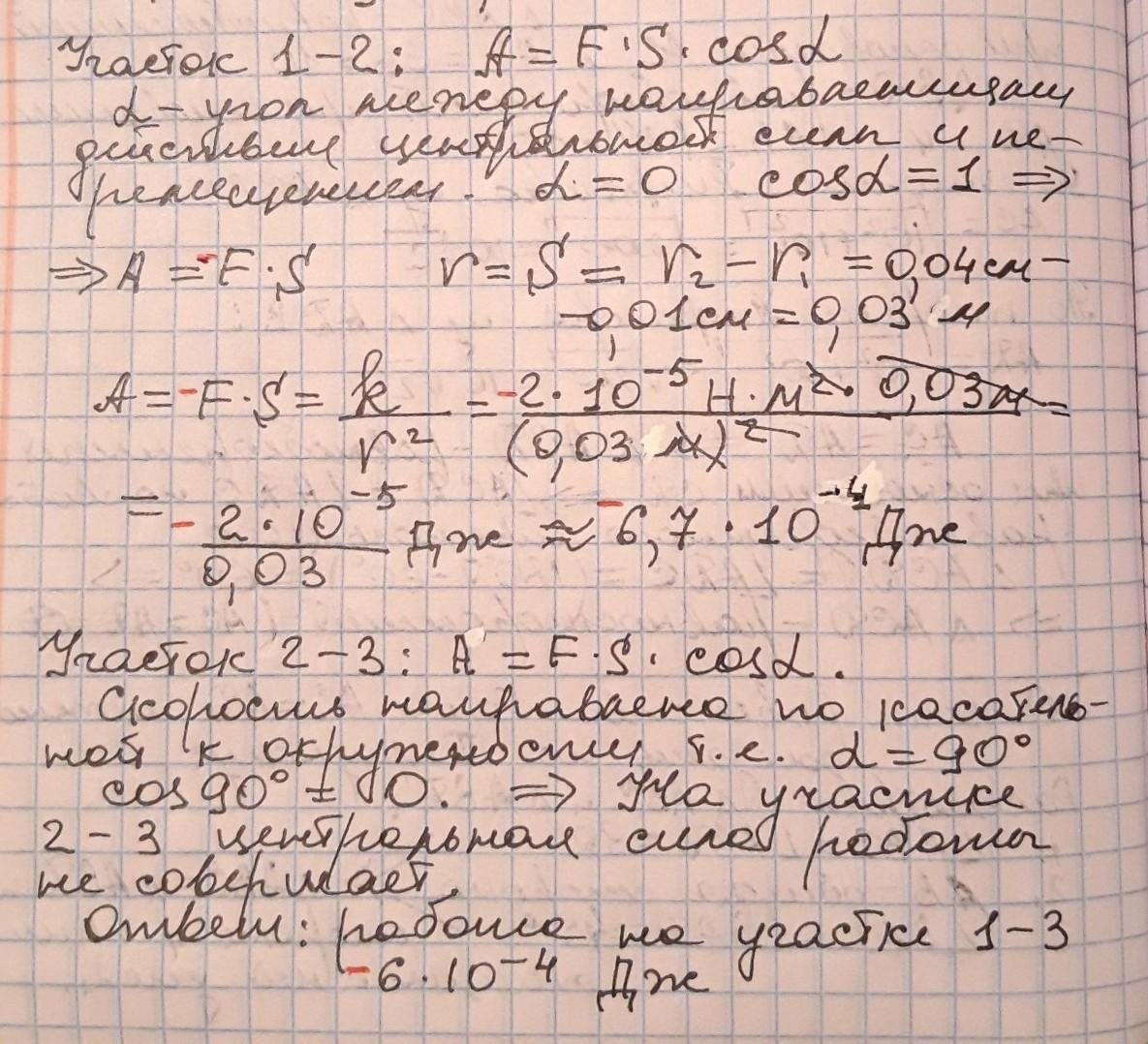 -6×10^(-4) Дж. Работа центральной силы отрицательна, т.к. на участке 1 -
