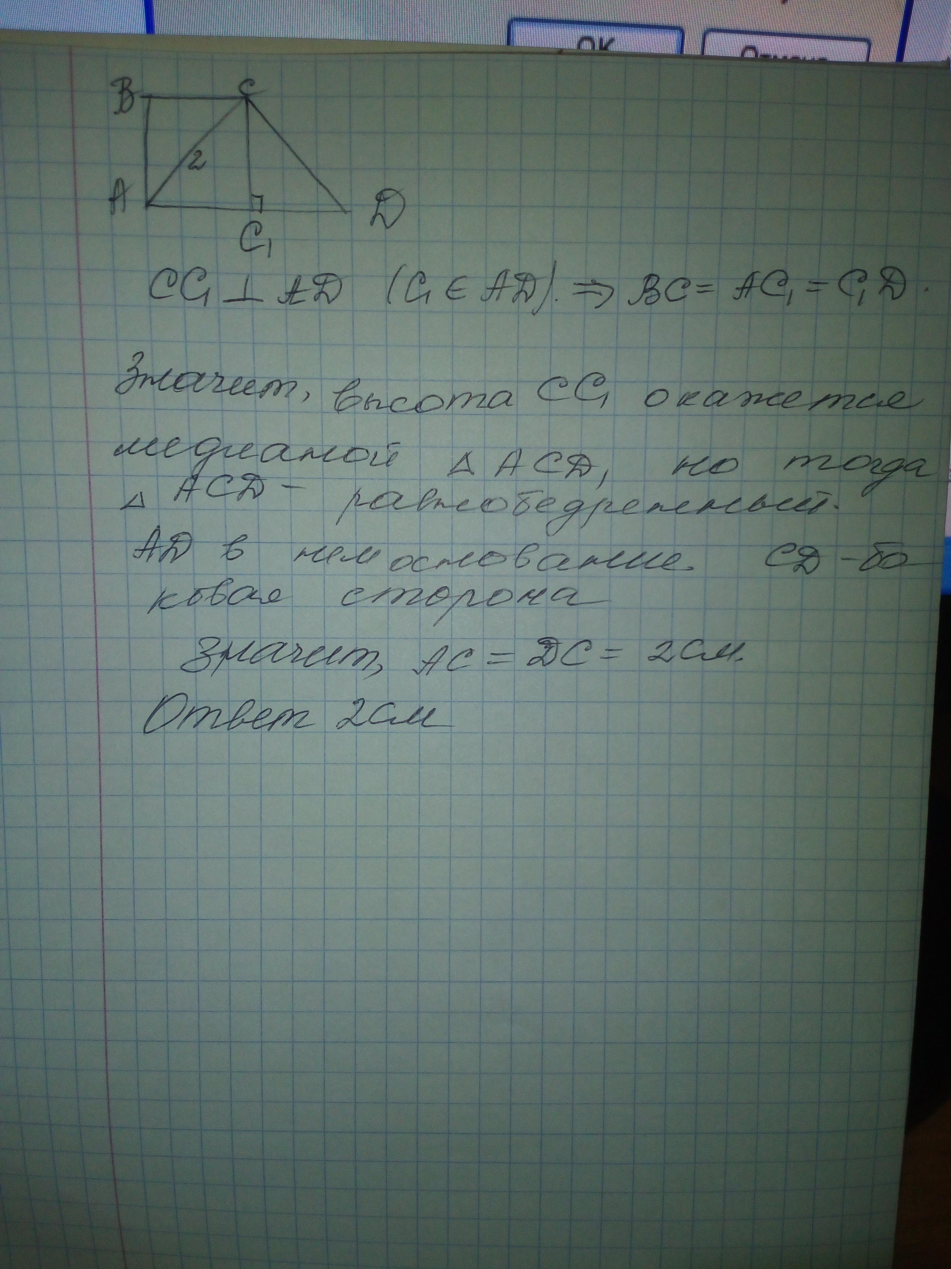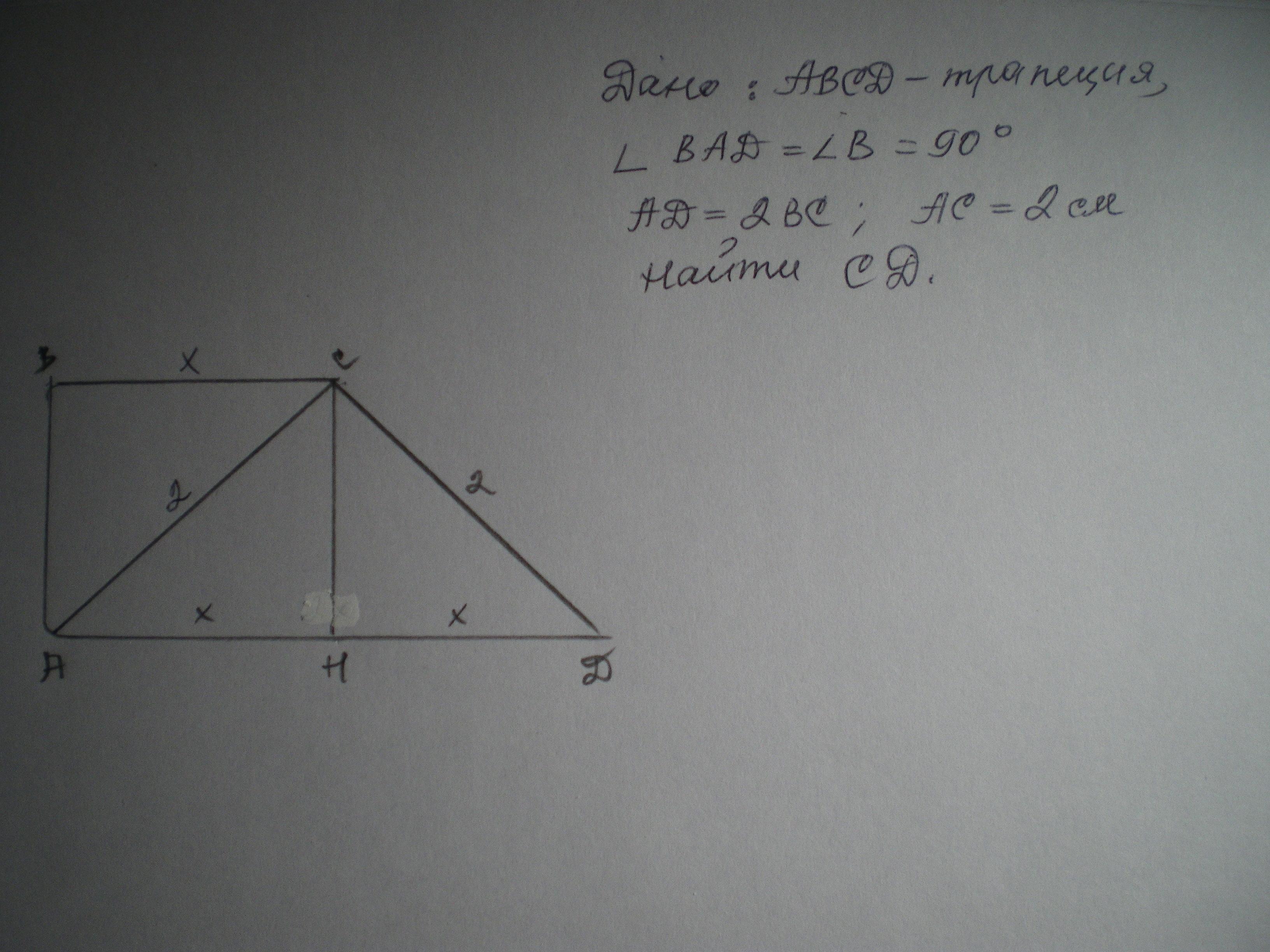 в прямоугольной трапеции ABCD AB перпендикулярна AD основа BC вдвое меньше АD а диагональ AC равна 2 см Найдите большую боковую сторону трапеции