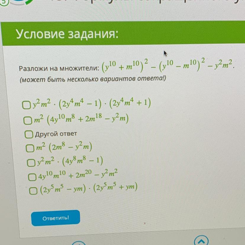 (y¹⁰ + m¹⁰)² - (y¹⁰ - m¹⁰)² - y²m² =(y¹⁰ + m¹⁰ - y¹⁰ + m¹⁰)(y¹⁰ + m¹⁰ + y¹⁰ - m¹⁰) -