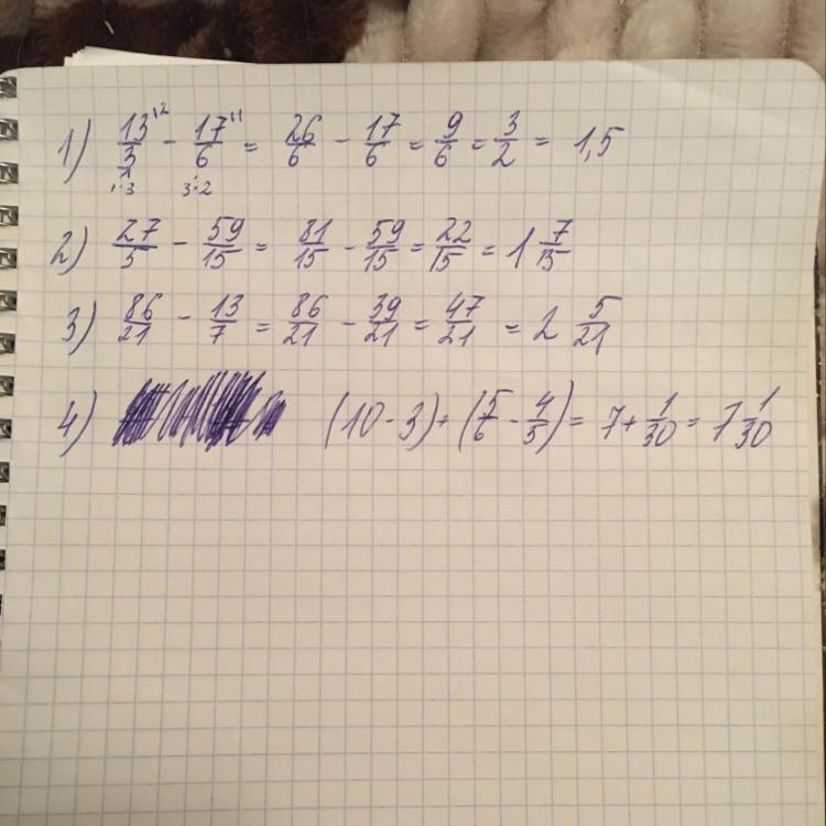 4)10 5/6 - 3 4/5 = 10 25/30 - 3 24/30 = 7 1/30