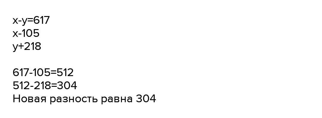 Разность двух чисел равна 617. Если уменьшаемое уменьшить на 105, а вычитаемое увеличить на 218, то чему равна новая разность?