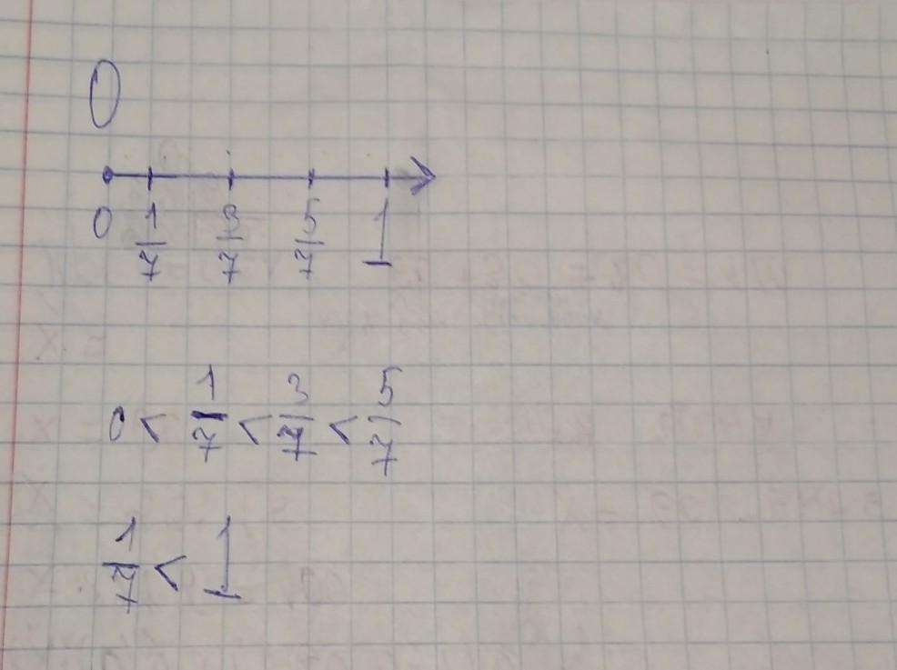 а) Начерти числовой луч прими за единицу 7 клеток тетради. Отметь дроби 1/7 3/7 5/7 1 на луче б)Запиши два неравенства