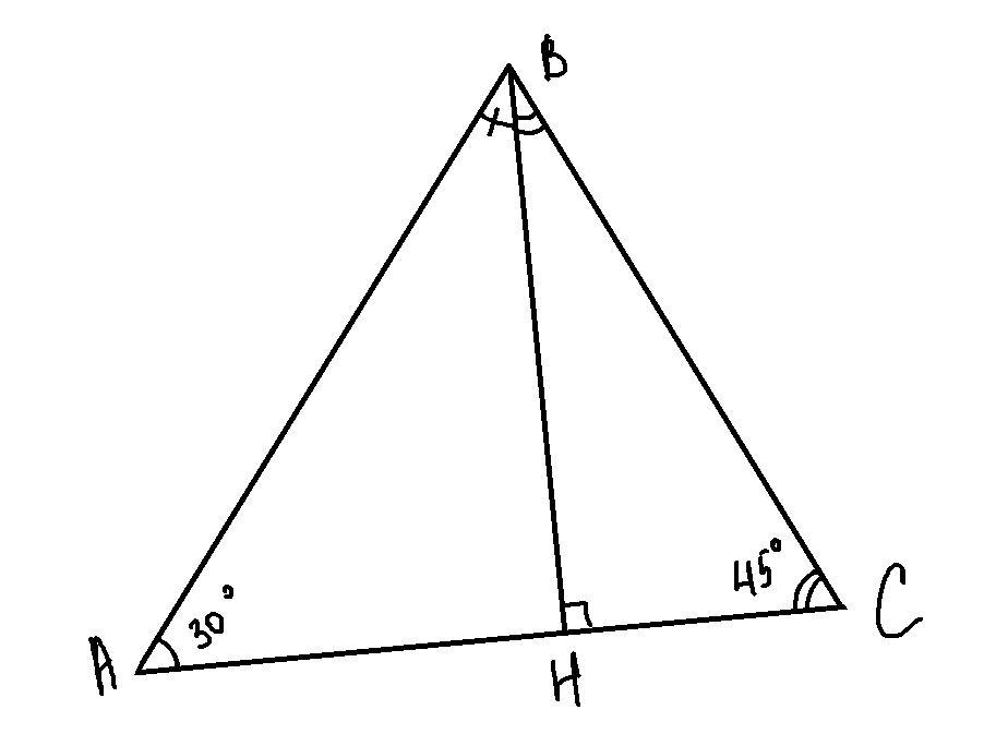 Висота трикутника дорівнює 4 см, а кути при основі дорівнюють 30* і 45*. Знайдіть площу трикутника.