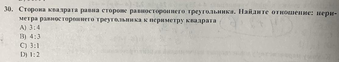 Пусть X - это сторона, тогда отношение периметра треугольника к периметру квадрата будет следующим, следовательно 3 к 4.