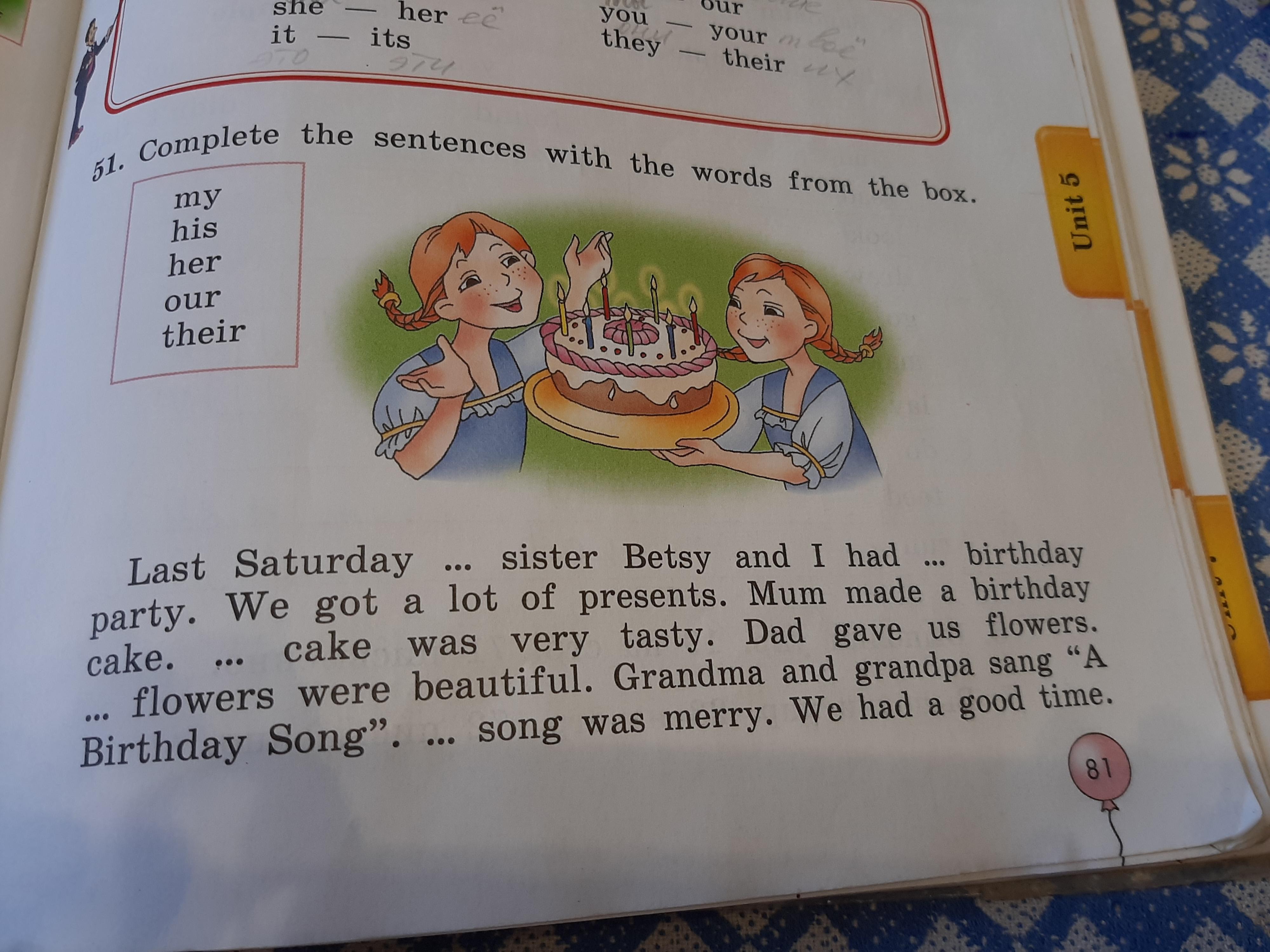 Last Saturday MY sister Betsy and I had OUR birthday party. We got a lot of presents. Mum made a birthday cake. HER cake was very tasty. Dad gave us flowers. HIS flowers were beautiful. Grandma and grandpa sang `` A Birthday Song``. THEIR song was merry. We had a good time.