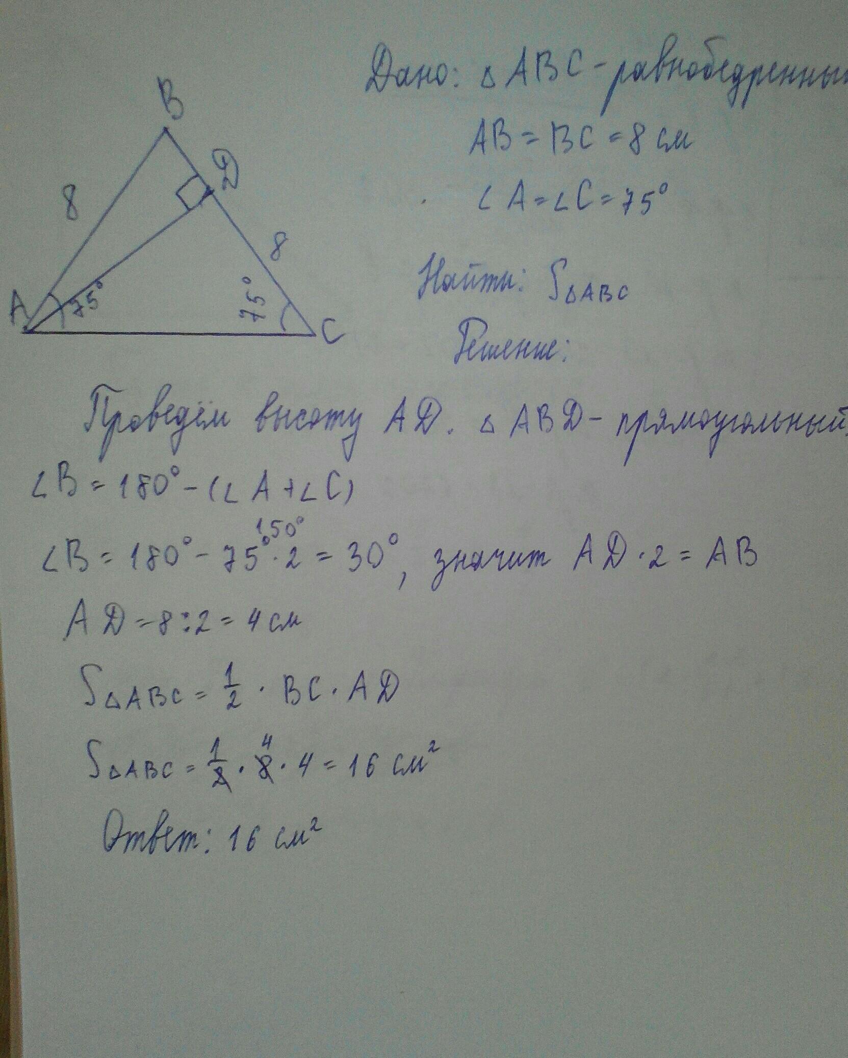 4.В равнобедренном треугольнике боковая сторона равна 8 см, а угол при основании равен 75°. Найдите площадь этого треугольника.