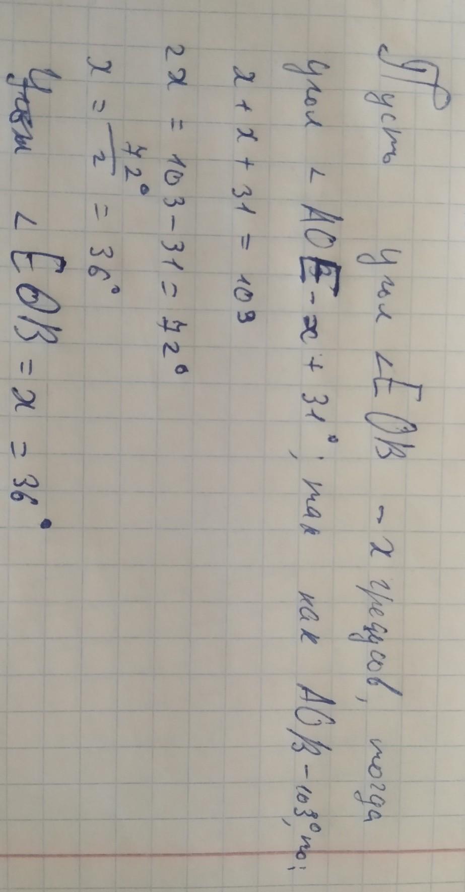 луч OE делит угол AOB на два угла. Найдите угол EOB,если угол AOB=103 градусов,а угол AOE=31 градусов больше угла EOB