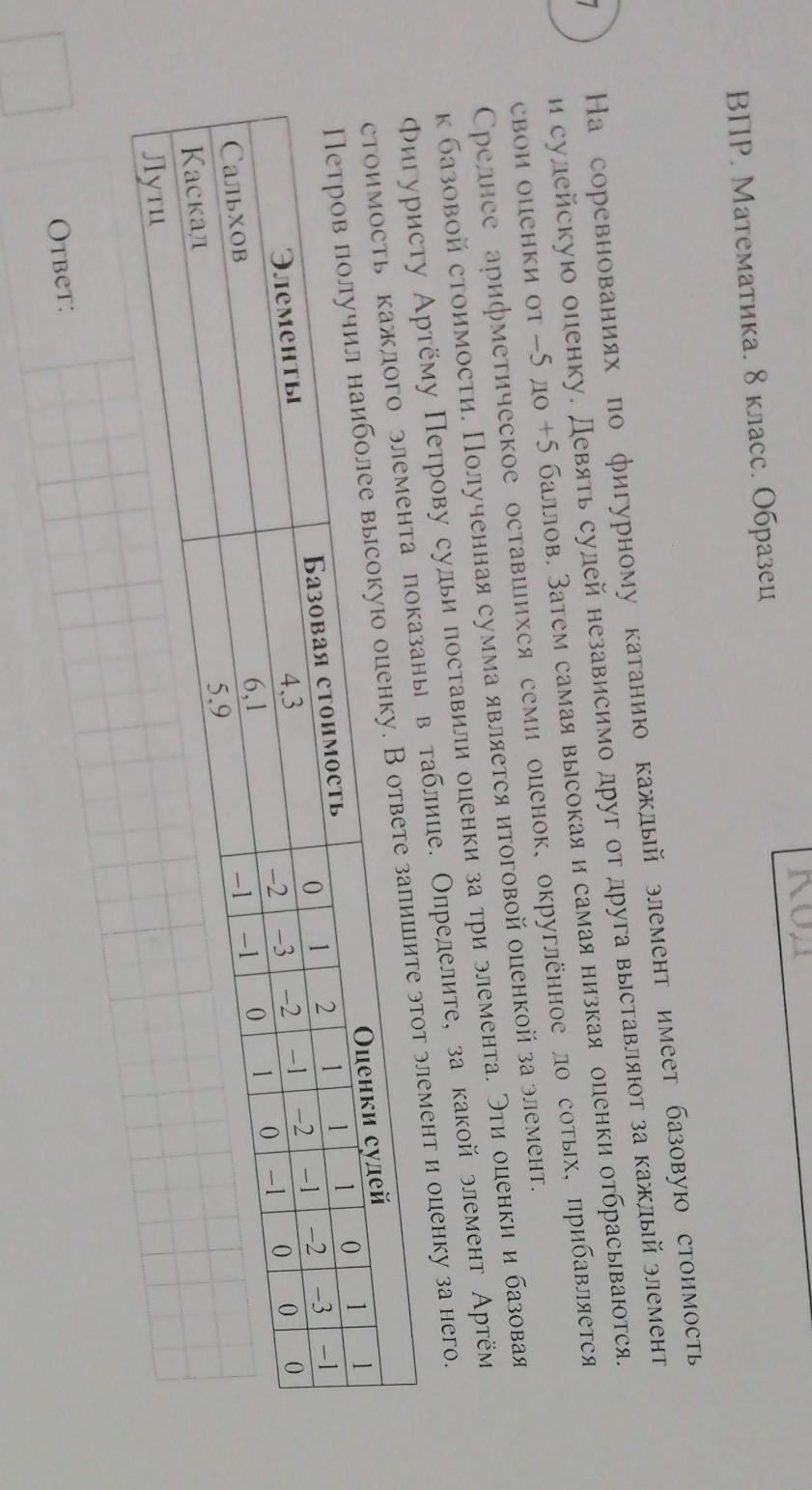 Объяснение:На соревнованиях по фигурному катанию каждый элемент имеет базовую стоимость и судейскую оценку. Девять судей независимо друг от друга выставляют за каждый элемент свои оценки от –5 до +5 баллов. Затем самая высокая и самая низкая оценки отбрасываются. Среднее арифметическое оставшихся семи оценок, округлённое до сотых, прибавляется к базовой стоимости. Полученная сумма является итоговой оценкой за элемент. Фигуристу Артёму Петрову судьи поставили оценки за три элемента. Эти оценки и базовая стоимость каждого элемента показаны в таблице. Определите, за какой элемент Артём Петров получил наиболее высокую оценку. В ответе запишите этот элемент и оценку за него без пробелов и других дополнительных символов.