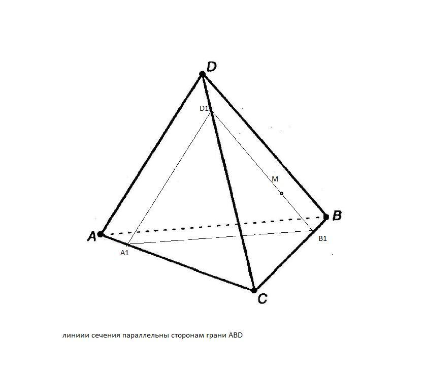 В тетраэдре DABC точка M - точка грани DBC. Построить сечение тетраэдра плоскостью, проходящей через точку M параллельно грани DAB.