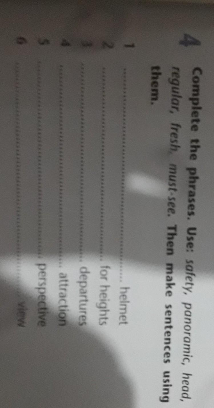 Complete the phrases. Use: safety, panoramic, head,