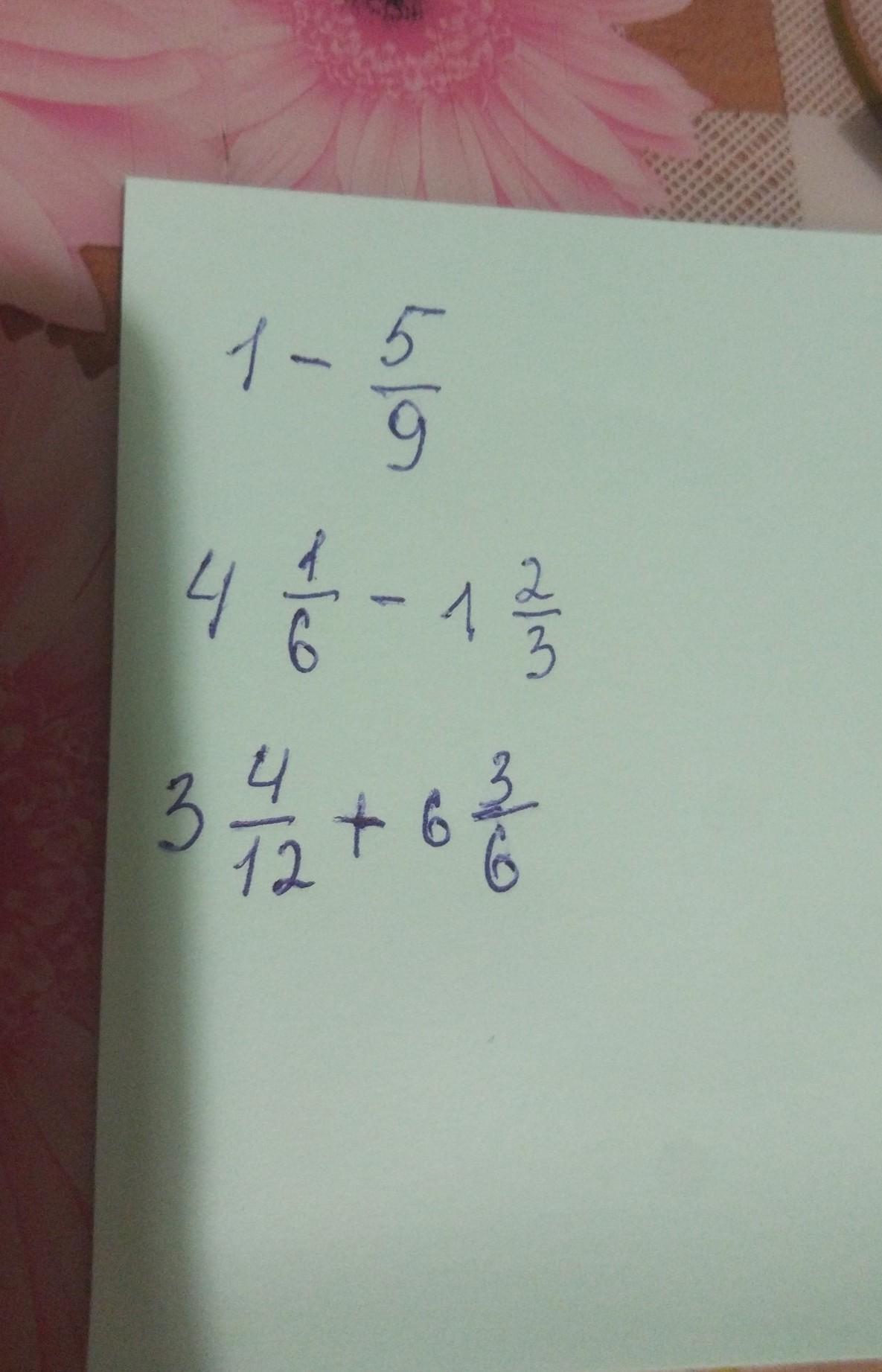 1-frac{5}{9}=frac{9}{9}-frac{5}{9}=frac{9-5}{9}=frac{4}{9}\4frac{1}{6}-1frac{2}{3}=frac{4*6+1}{6}-frac{2(3*1+2)}{3*2}=frac{25-10}{6}=frac{15}{6}=2frac{1}{2}\3frac{4}{12}+6frac{3}{6}=frac{12*3+4}{12}+frac{2(6*6+3)}{2*6}=frac{40+78}{12}=frac{118}{12}=9frac{10}{12}=9frac{5}{6}