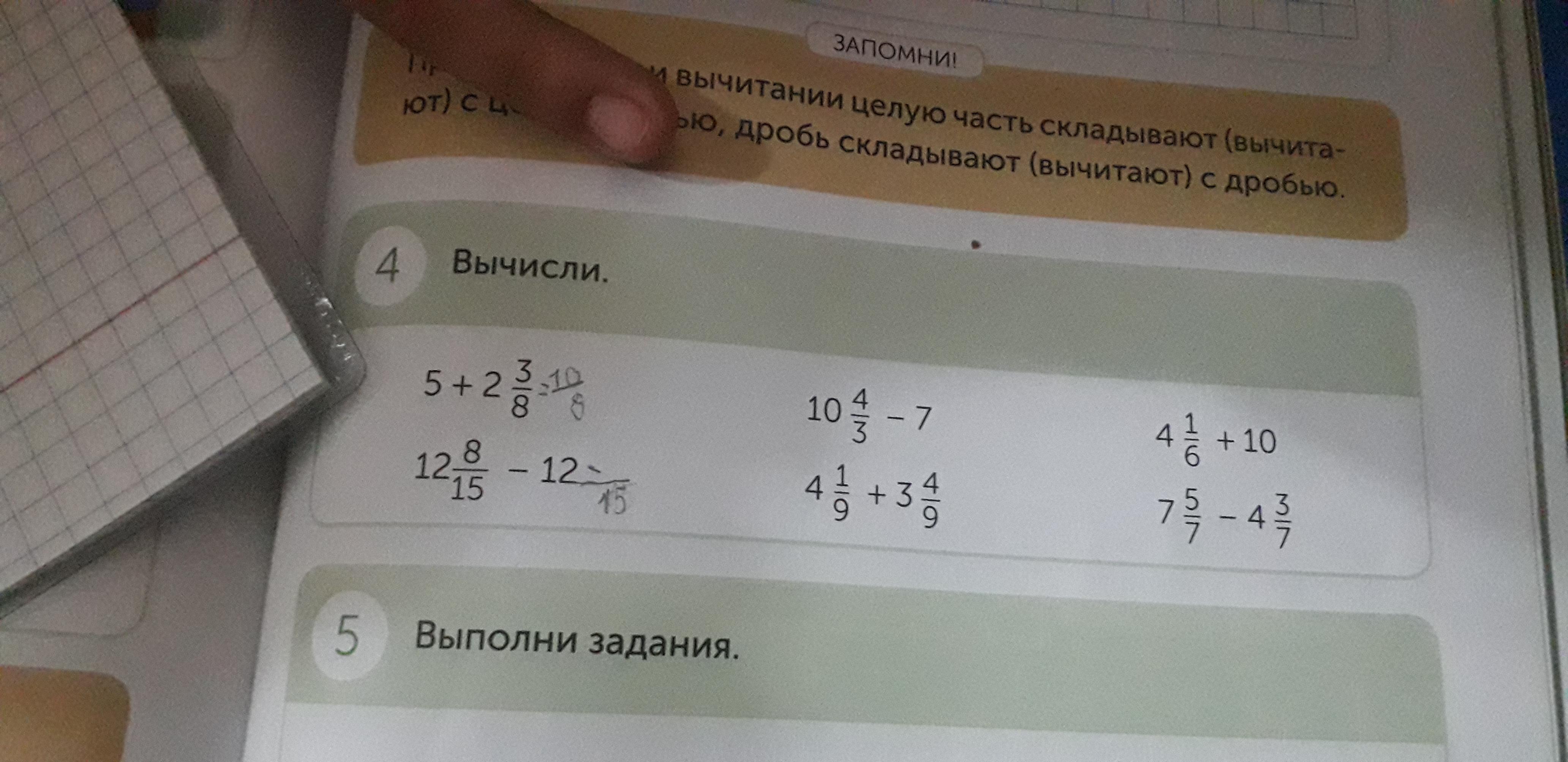 5 + 2 frac{3}{8} = 7 frac{3}{8} \\ 12 frac{8}{15} - 12 = frac{8}{15} \\ 10 frac{4}{3} - 7 = 3 frac{4}{3} \\ 4 frac{1}{9} + 3 frac{4}{9} = 7 frac{5}{9} \\ 4 frac{1}{6} + 10 = 14 frac{1}{6} \\ 7 frac{5}{7} - 4 frac{3}{7} = 3 frac{2}{7}