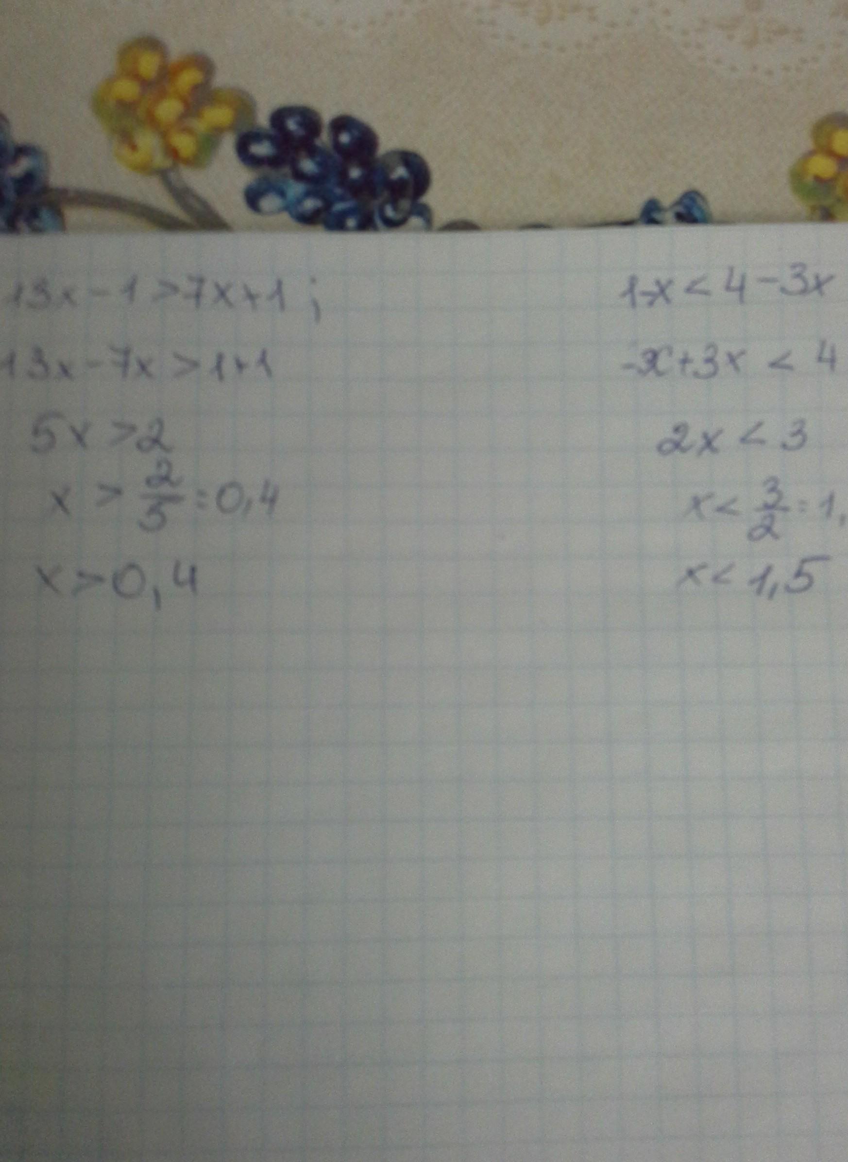 Помогитееее @[email protected] 13x-1>7x+1; 1-x<4-3x