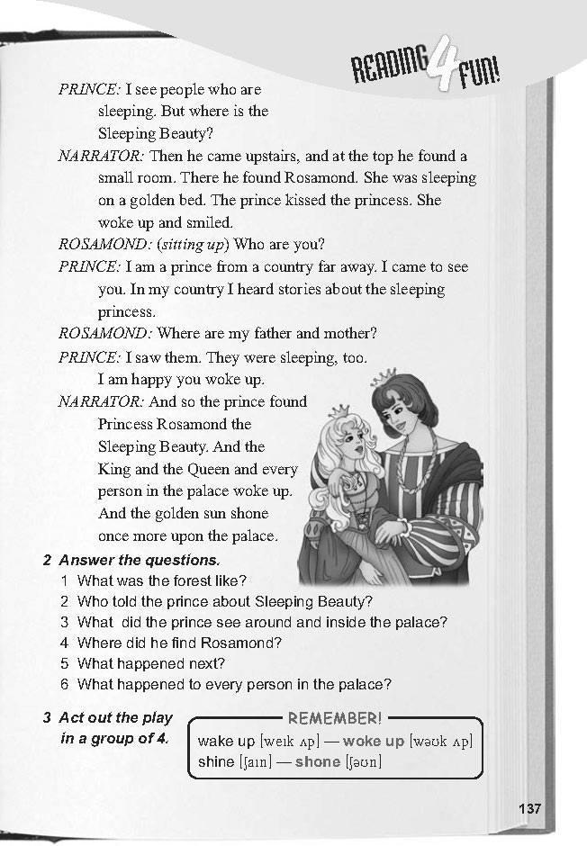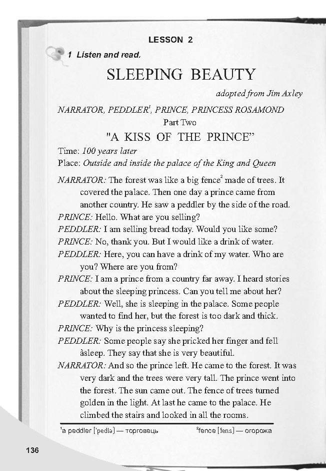 «ПОЦЕЛУЙ ПРИНЦА» Время: 100 лет спустя Место: Снаружи и внутри дворца Короля и Королевы Рассказчик: Лес был как большой забор, сделанный из деревьев. Это покрыло дворец. Затем однажды принц приехал из другой страны. Он увидел торговца на обочине дороги. ПРИНЦ: Привет. Что вы продаете? ПЕДДЛЕР: Я сегодня продаю хлеб. Не хотите ли? ПРИНЦ: Нет, спасибо. Но я бы хотел выпить воды. PEDDLER: Здесь вы можете выпить моей воды. Кто ты? Откуда ты? ПРИНЦ: Я принц из далекой страны. Я слышал истории о спящей принцессе. Можешь рассказать мне о ней? ПЕДДЛЕР: Ну, она спит во дворце. Некоторые хотели ее найти, но лес слишком темный и густой. ПРИНЦ: Почему спит принцесса? ПЕДДЛЕР: Некоторые люди говорят, что она уколола палец и уснула. Говорят, что она очень красивая. Рассказчик: И поэтому принц ушел. Он пришел в лес. Было очень темно, и деревья были очень высокими. Принц ушел в лес. Солнце вышло. Забор деревьев поблескивал на свету. Наконец он пришел во дворец. Он поднялся по лестнице и заглянул во все комнаты. ЧИТАЙТЕ ВЕСЕЛЬЕ! ПРИНЦ: Я вижу людей, которые спят. Но где же Спящая красавица? Рассказчик: Затем он поднялся наверх, и наверху он нашел небольшую комнату. Там он нашел Розамонд. Она спала на золотой кровати. Принц поцеловал принцессу. Она проснулась и улыбнулась. РОСАМОНД: (садясь) Кто ты? ПРИНЦ: Я принц из далекой страны. Я пришел к вам. В моей стране я слышал рассказы о спящей принцессе. РОСАМОНД: Где мой отец и мать? ПРИНЦ: Я их видел. Они тоже спали. Я рад, что ты проснулся. Рассказчик: И принц нашел принцессу Розамонду Спящую красавицу. И проснулись король, королева и все люди во дворце. И золотое солнце снова осветило дворец.