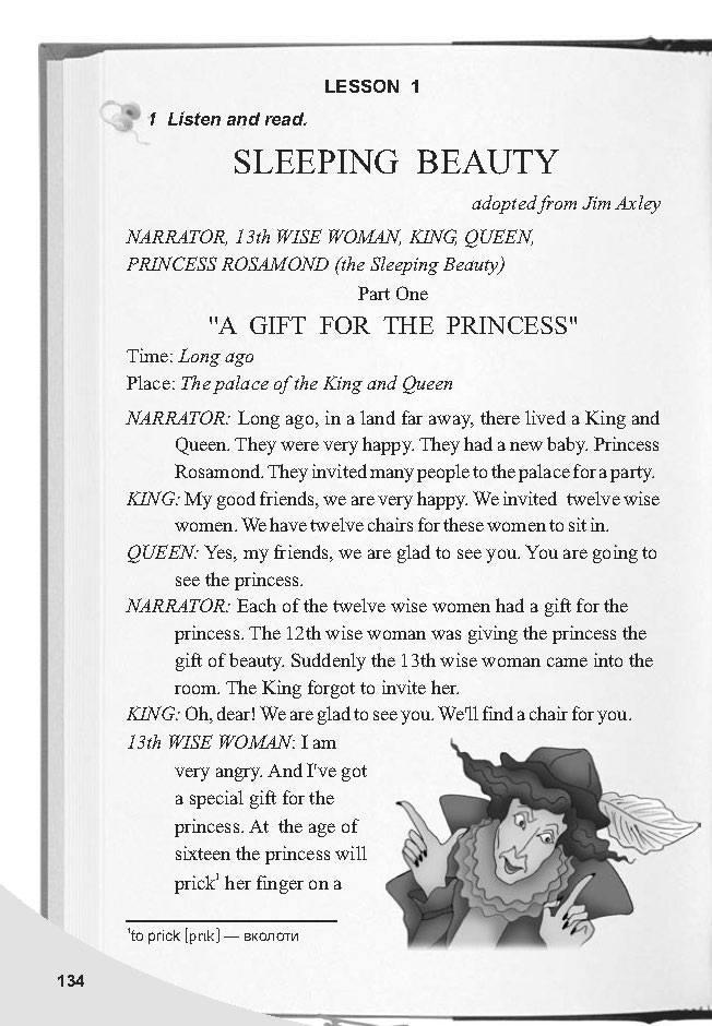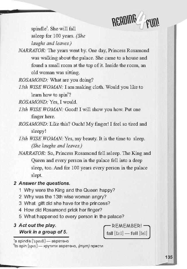 "ПОДАРОК ПРИНЦЕССЕ" Время: давно Место: Дворец Короля и Королевы Рассказчик: Давным-давно, в далекой стране жили Король и Королева. Они были очень рады. У них был новый ребенок. Принцесса Розамонд. Они пригласили много людей во дворец для вечеринки. КИНГ: Мои хорошие друзья, мы очень счастливы. Мы пригласили двенадцать мудрых женщин. У нас есть двенадцать стульев для этих женщин. КОРОЛЕВА: Да, друзья, мы рады вас видеть. Вы собираетесь увидеть принцессу. Рассказчик: У каждой из двенадцати мудрых женщин был подарок для принцессы. 12-я мудрая женщина дарила принцессе подарок красоты. Внезапно в комнату вошла 13-я мудрая женщина. Король забыл пригласить ее. КИНГ: О, дорогой! Мы рады вас видеть. Мы найдем стул для вас. 13-я мудрая женщина: Я очень зол. И у меня есть специальный подарок для принцессы. В шестнадцать лет принцесса укажет пальцем ЧИТАЙТЕ ВЕСЕЛЬЕ! шпинделя. Она уснет на 100 лет. (Она смеется и уходит.) Рассказчик: Шли годы. Однажды принцесса Розамонд гуляла по дворцу. Она пришла в дом и нашла небольшую комнату наверху. Внутри комнаты сидела старуха. РОСАМОНД: Что ты делаешь? 13-я мудрая женщина: я делаю одежду. Хотите научиться крутить? РОСАМОНД: Да, я бы. 13-я мудрая женщина: Хорошо! Я покажу вам, как. Положите один палец сюда. РОСАМОНД: Как это? Ой! Мой палец! Я чувствую себя таким усталым и сонным! 13-я мудрая женщина: Да, моя красавица. Время спать. (Она смеется и уходит.) Рассказчик: Итак, принцесса Розамонд уснула. Король, королева и все люди во дворце тоже погрузились в глубокий сон. И на протяжении 100 лет каждый человек во дворце спал.