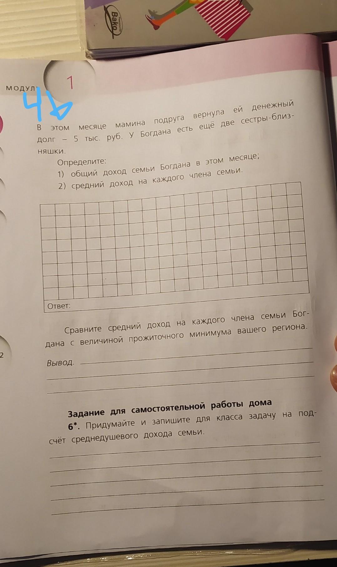 (4 все) семья Богдана живёт в нашем районе в этом месяце бабушка с дедушкой прислали Богдану на день рождения 2000руб. Папа получил заработную плату в размере 24000 руб и время за высокие результаты в работе 5000руб. Заработная плата мама составила 19 руб в этом месяце мамина подруга вернула единичный долг 5000руб Богдана есть ещё две сестры близняшки