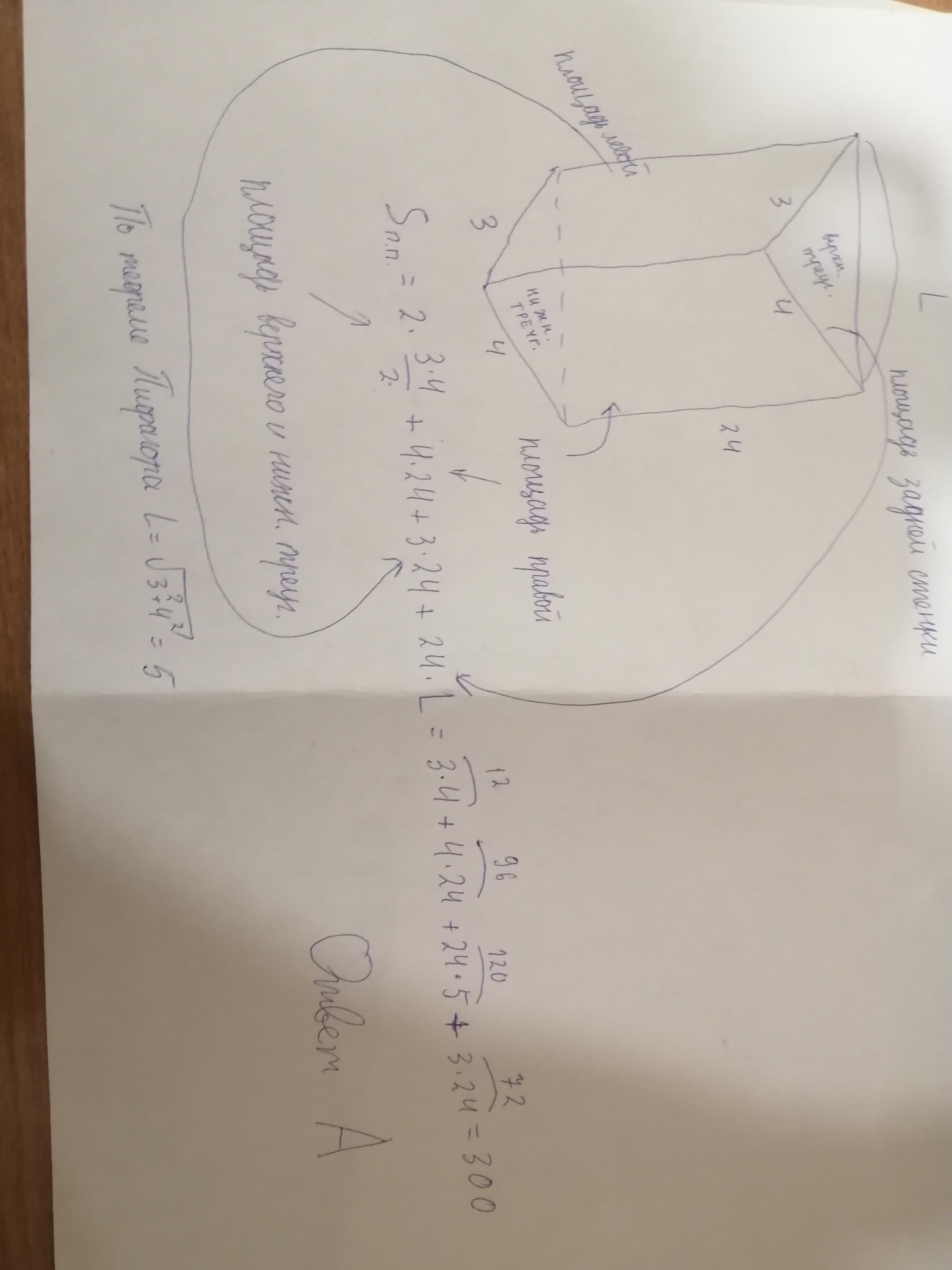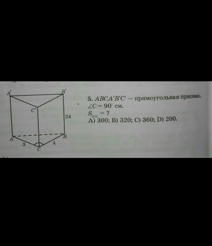 площадь основания 1/2 АС*СВ = 1/2*3*4=6 , а так как оснований 2, то общая площадь оснований 6*2=12