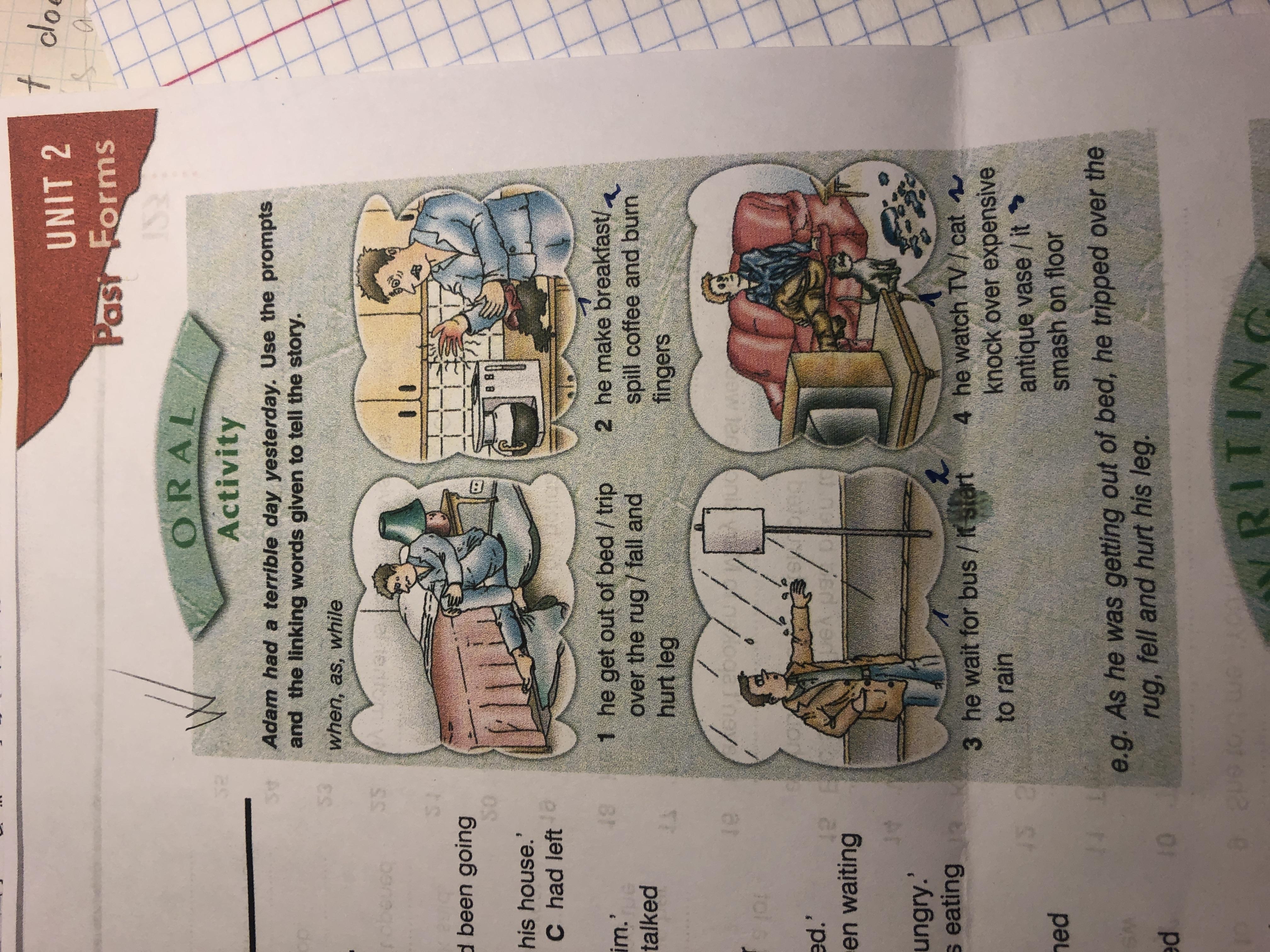 2. While he was making breakfast, he spilled coffee and burnt fingers.