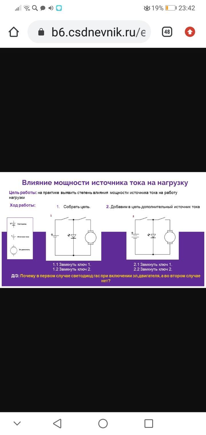 Во втором случае мощность источника тока вдвое больше, поэтому тока хватает и на светодиод, и на двигатель