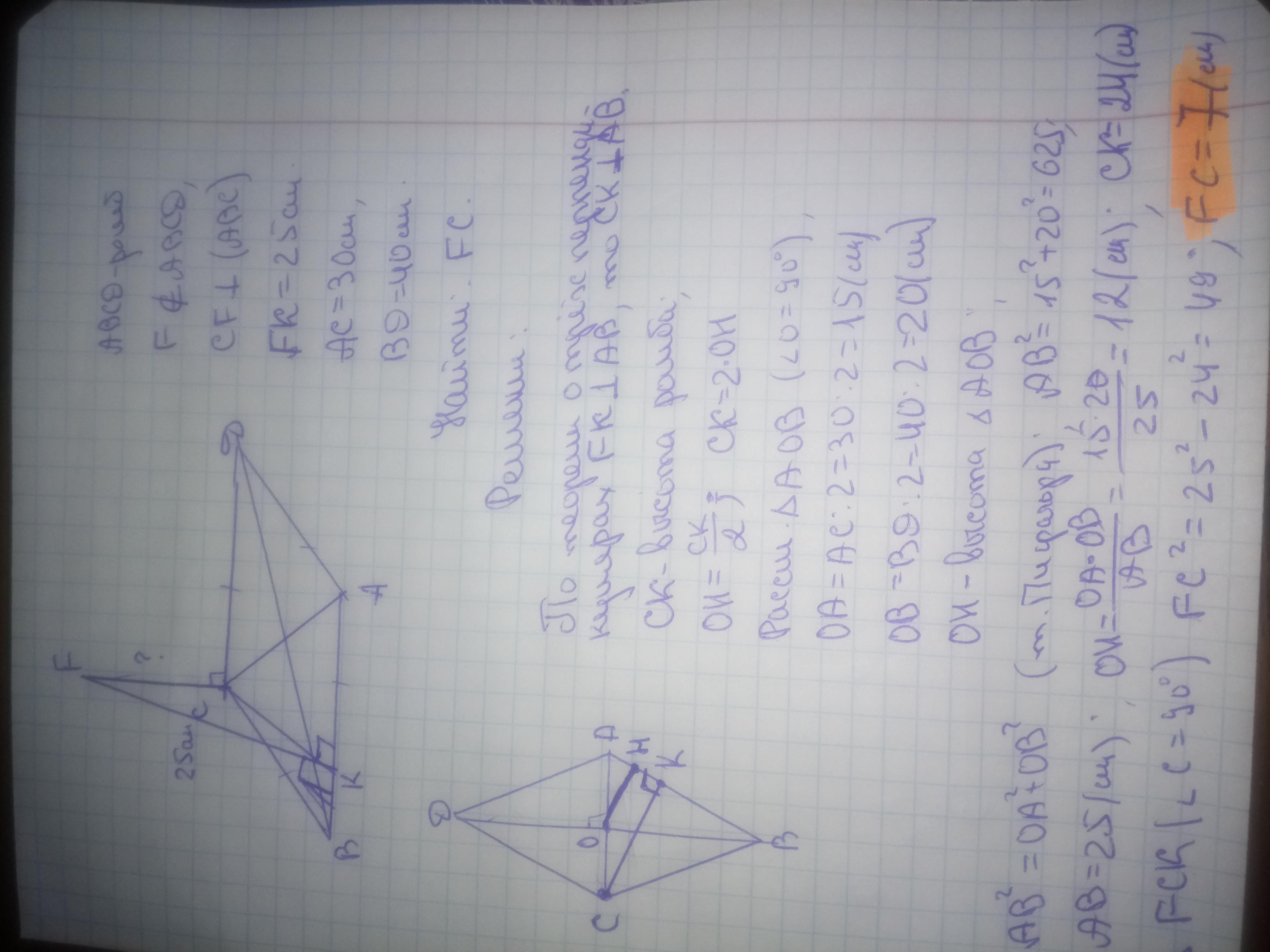 Из вершины С ромба ABCD к его плоскостям проведён перпендикуляр CF. Точка F удалённая от сторон АВ на 25 см. Найти растояние от точки F до плоскостей ромба, диагонали ровны 40 и 30 см. (можно пожалуйста с решением расписать очень нужно)