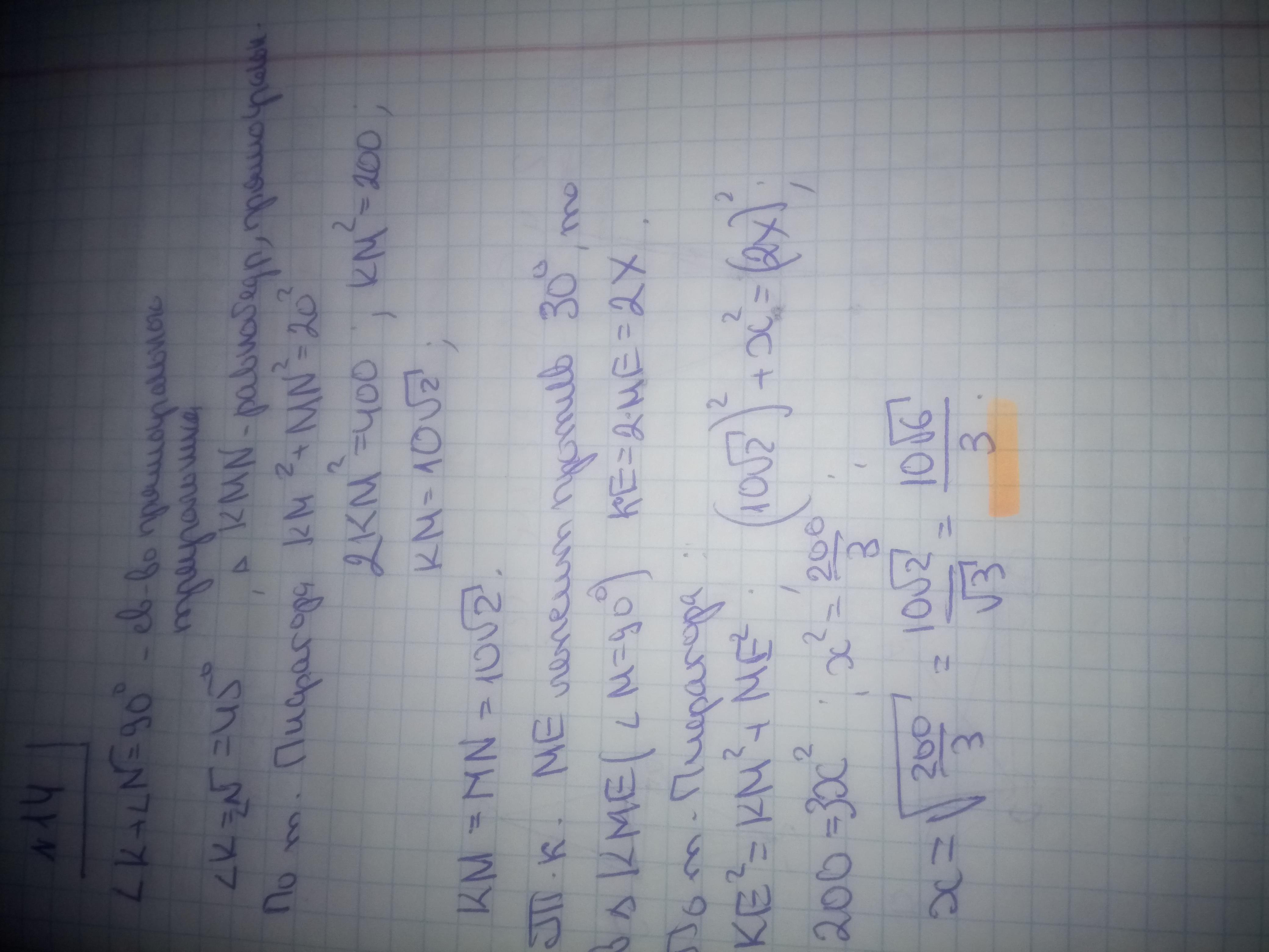 МК=МN, т.к. треугольник прямоугольный и один угол 45°, тогда и другой острый 45,° КN²=2*МК², КN=(20)/√2=10√2, из прямоугольного треугольника КМЕ МЕ=МК*tg30°=10√2/√3=10√6/3