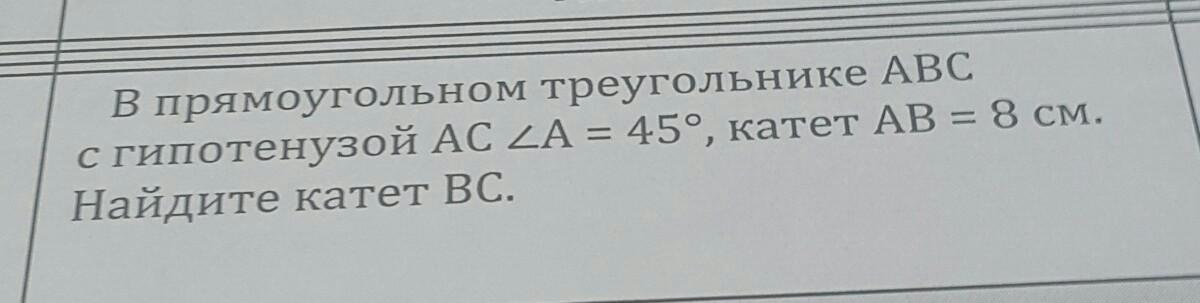 В прямоугольном треугольнике сумма острых углов равна 90°, <c=90-45=45°, значит треугольник Авс равнобедренная т. к. углы равны. Так как он равнобедренный его катеты равны, а значит AB=BC=8