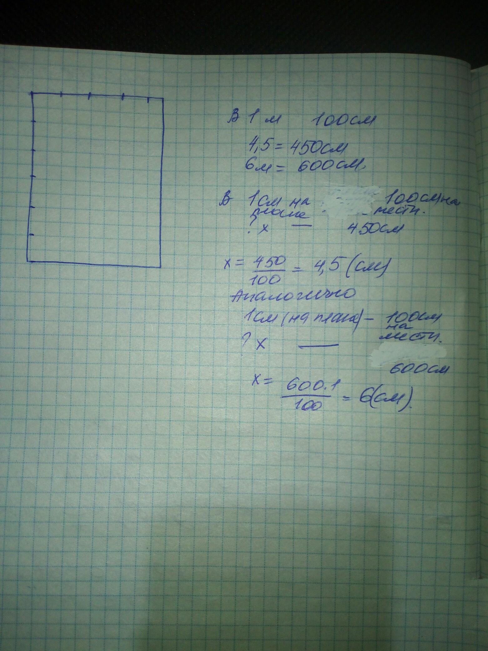 90 БАЛЛОВ ПОМОГИ УМНЫЙ ЧЕЛОВЕЧИК УМОООЛЯЮ Нарисуйте план комнаты прямоугольной формы, размеры которой — 4,5 м на 6 м. Масштаб чертежа — 1 : 100. Прикрепите чертёж и решение.