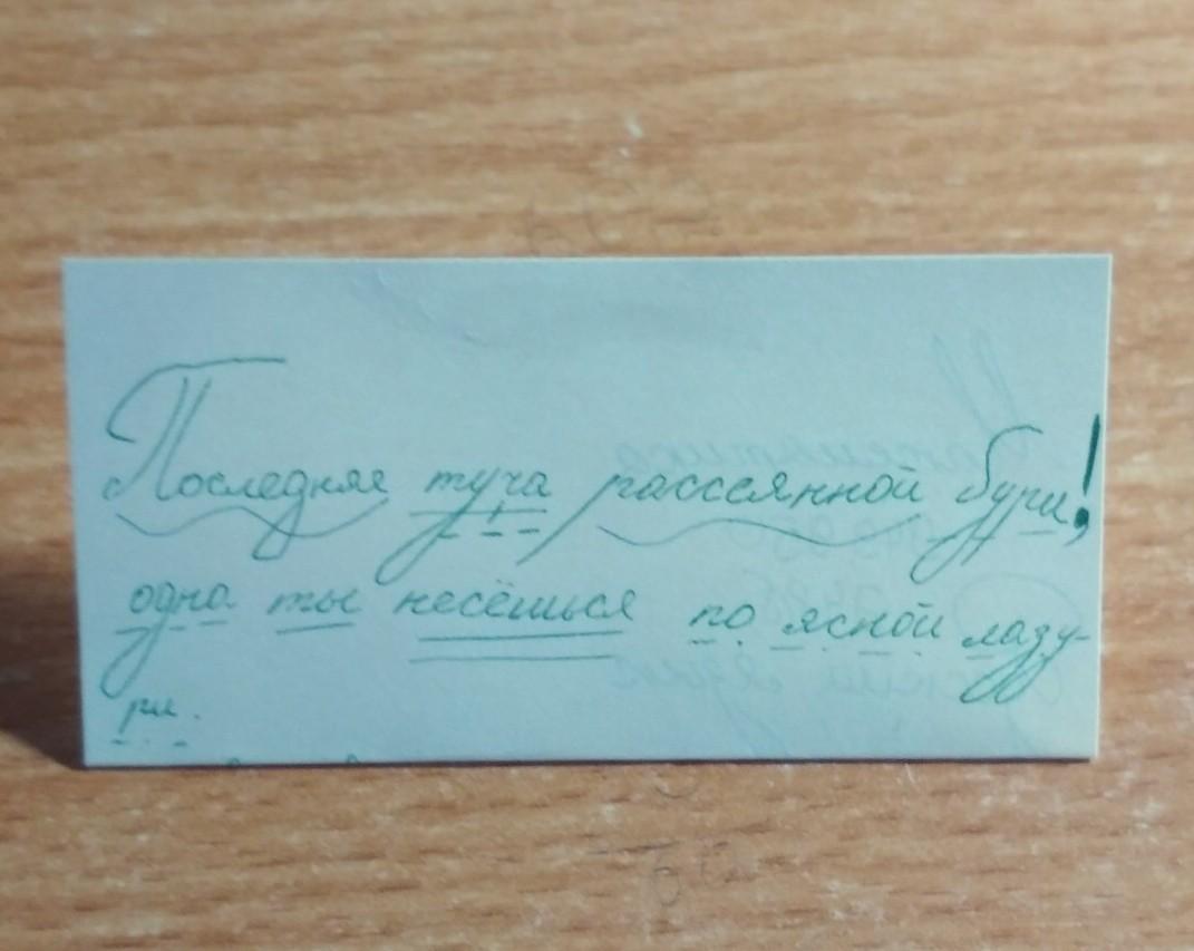 последняя-им.прил. туча сущ. рассеянной-им.прил. бури-им.сущ. одна-местоим. ты-местоим. несёшься-глагол. по-предлог. ясной-им. прил. лазури-им.сущ.
