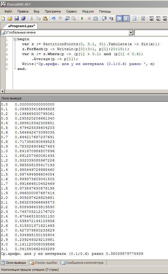 Протабулировать функцию y = sinx на промежутке [0; 3,1], с шагом h = 0,1 и рассчитать среднее арифметическое(Sl) значений функций больших, чем 0,1 и меньших, чем 0,6.