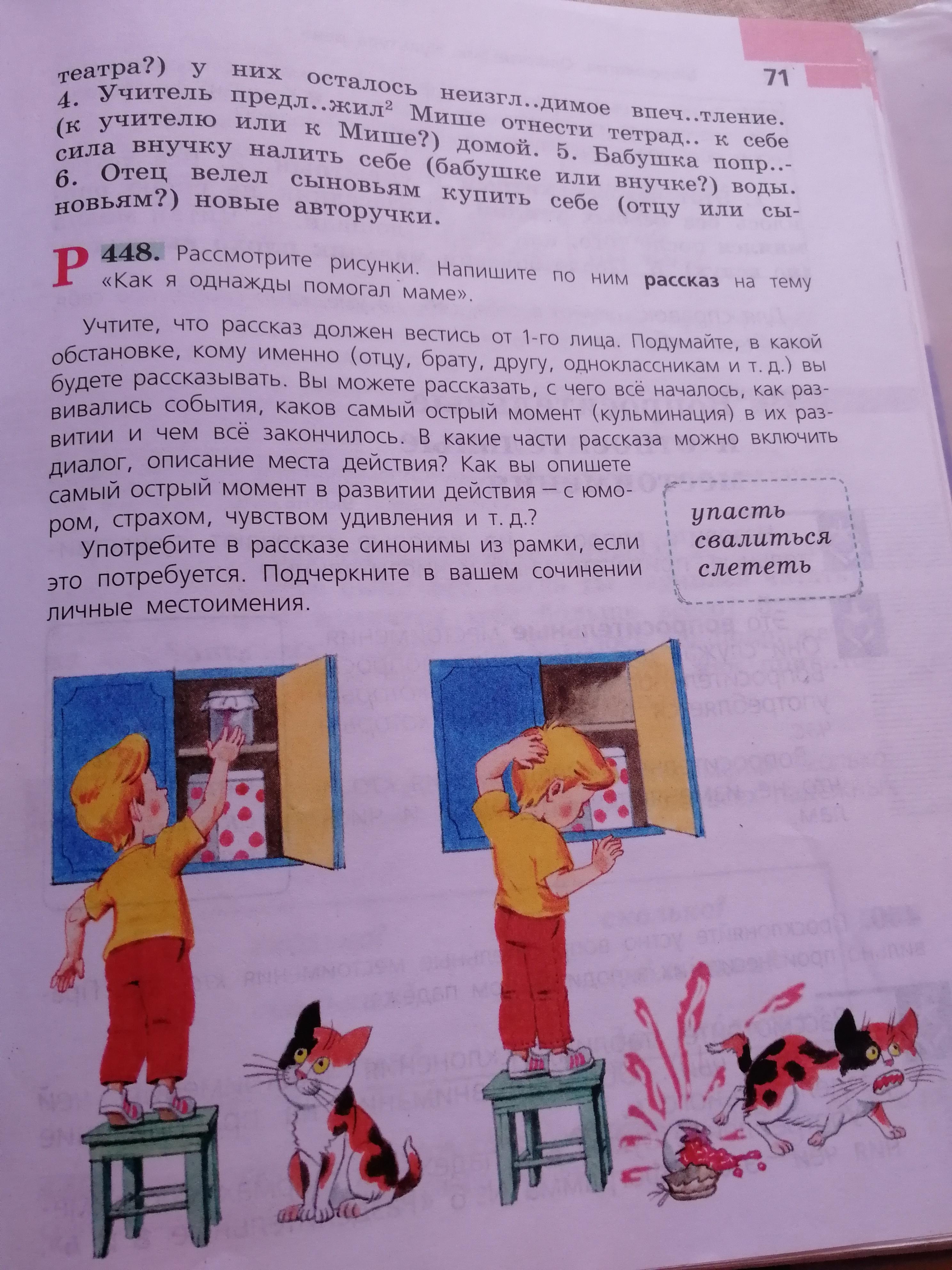Однажды я решил помочь маме. Я не стал ее тревожить так-как она спала. Сначала я решил убрать пыль, сначала все получалось нормально,но потом я решил убрать пыль и в кухонном шкафу. Я поставил стул,и открыл шкафчик. Там было варенье,и я не думая бросил тряпку,и полез к варенью. Рядом со мной стоял и наблюдал мой кот (Назовем Барсик), вдруг он прыгнул на меня, я успел схватиться за ручку шкафа,но вот у варенья рук нет. Оно упало. Кот начал убегать, и я пустился за ним. Мы выбежали на улицу, а я уже слышал как мама от шума поднялась. Она подошла к дверьному проему и ахнула. Она крикнула мне "(имя) ты где?". Я не отозвался. Мама крикнула еще. И на 4-ый раз моя совесть не выдержала,я подошел и рассказал обо всем. Моя мама не стала кричать, а просто вздохнула,и принесла другую банку варенья. А так-же она принесла немного корма Барсику. Я понял что не надо самим что-то брать, делать без спроса. И теперь Мы с моим Барсиком каждый день помогаем маме,а когда нам нужна помощь она помогает нам)