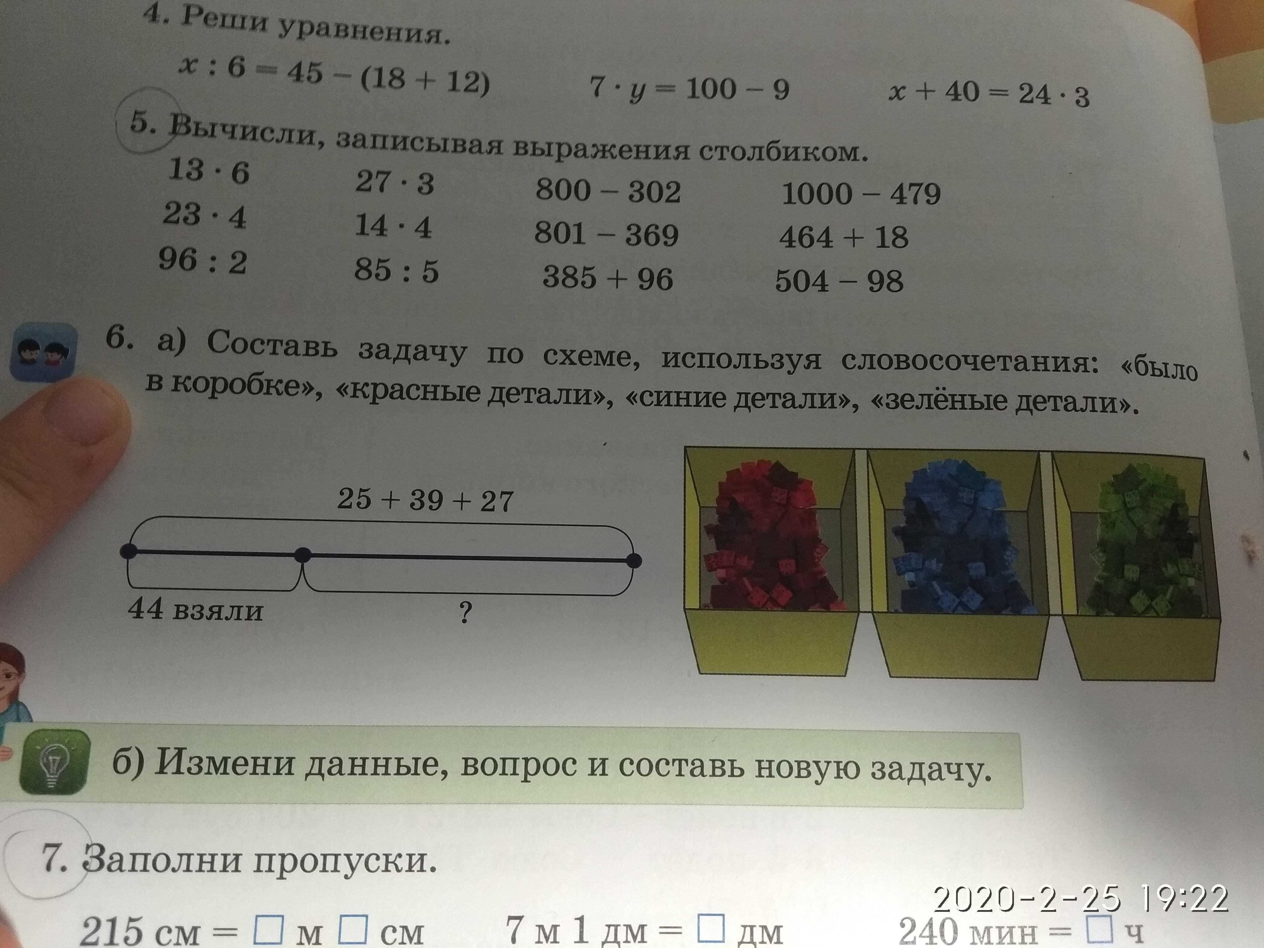 В первой коробке было 25 красных деталей, во второй коробке 39 синих деталей, в третьей 27 зеленых деталей.
