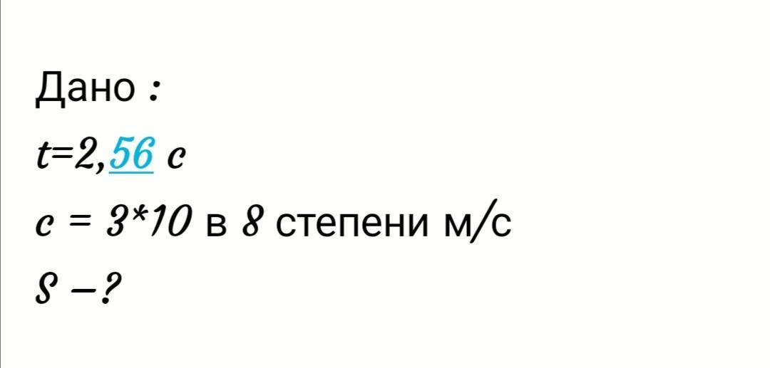 S = vt = ct = 3 · 10⁸ · 2,56 = 7,68 · 10⁸ (м) = 768 000 км