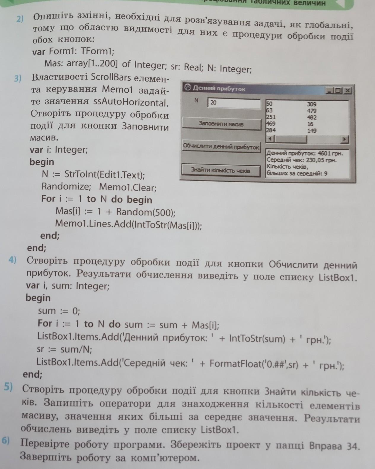3) Властивості ScrollBars елемента керування Memo1 задайте значення ssAutoHorizontal. Створіть процедуру обробки події для кнопки Заповнити масив.