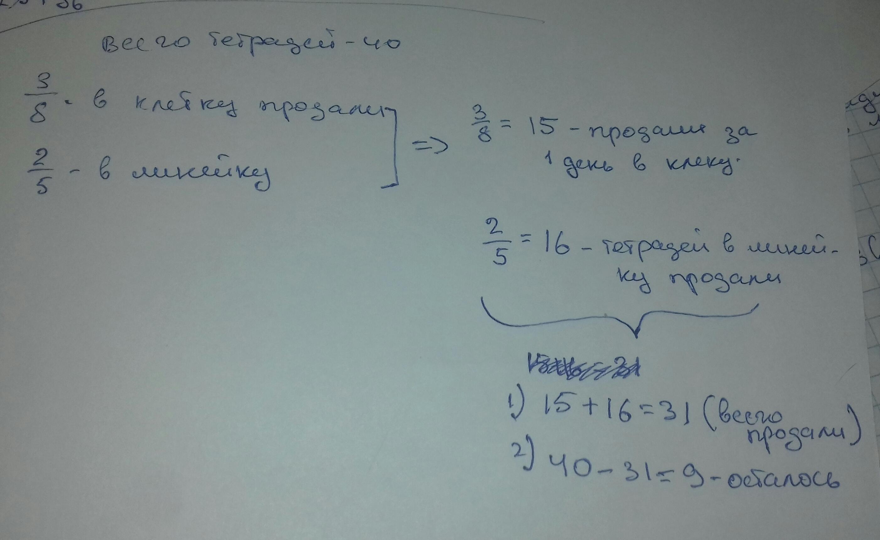 киоске было 40 тетрадей из них за день продали в клетку три восьмых числа всех тетрадей в линейку 2/5 числа всех тетрадей сколько тетрадей в клетку продали за день сколько тетрадей в линейку продали за день сколько всего тетрадей продали за день