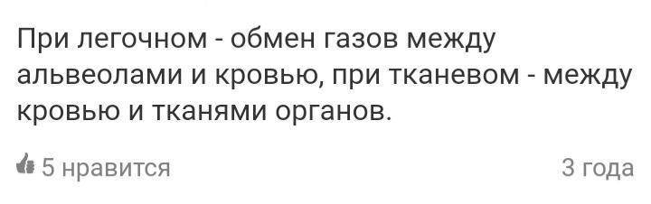 При легочном газообмене обмен газами происходит между ольвеолами лёгких и окружающей средой. Через лёгкие кислород попадает в кровь. И уже оттуда по кровеносным сосудам артериальная кровь, насыщенная кислородом, доставляется в ткани. Тканевый газообмен заключается в том что в кровь отдаёт клеткам кислород, благодаря которому происходят химические реакции, и забирает от них углекислый газ и продукты реакций. Далее венозная кровь с углекислым газом попадает в лёгкие, где снова происходит газообмен в лёгких, благодаря которому углекислый газ из венозной крови попадает уже в окружающую среду.