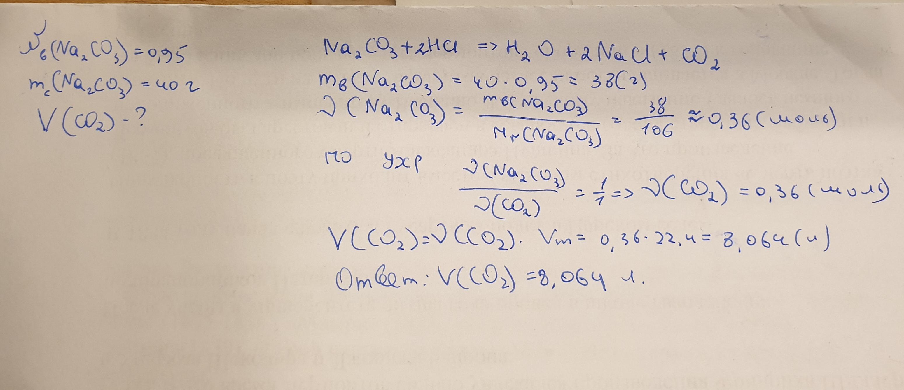На 40 грамм кальцинированной соды, содержащей 5% примесей, подействовали соляной кислотой. Найти объем выделяющегося газа!