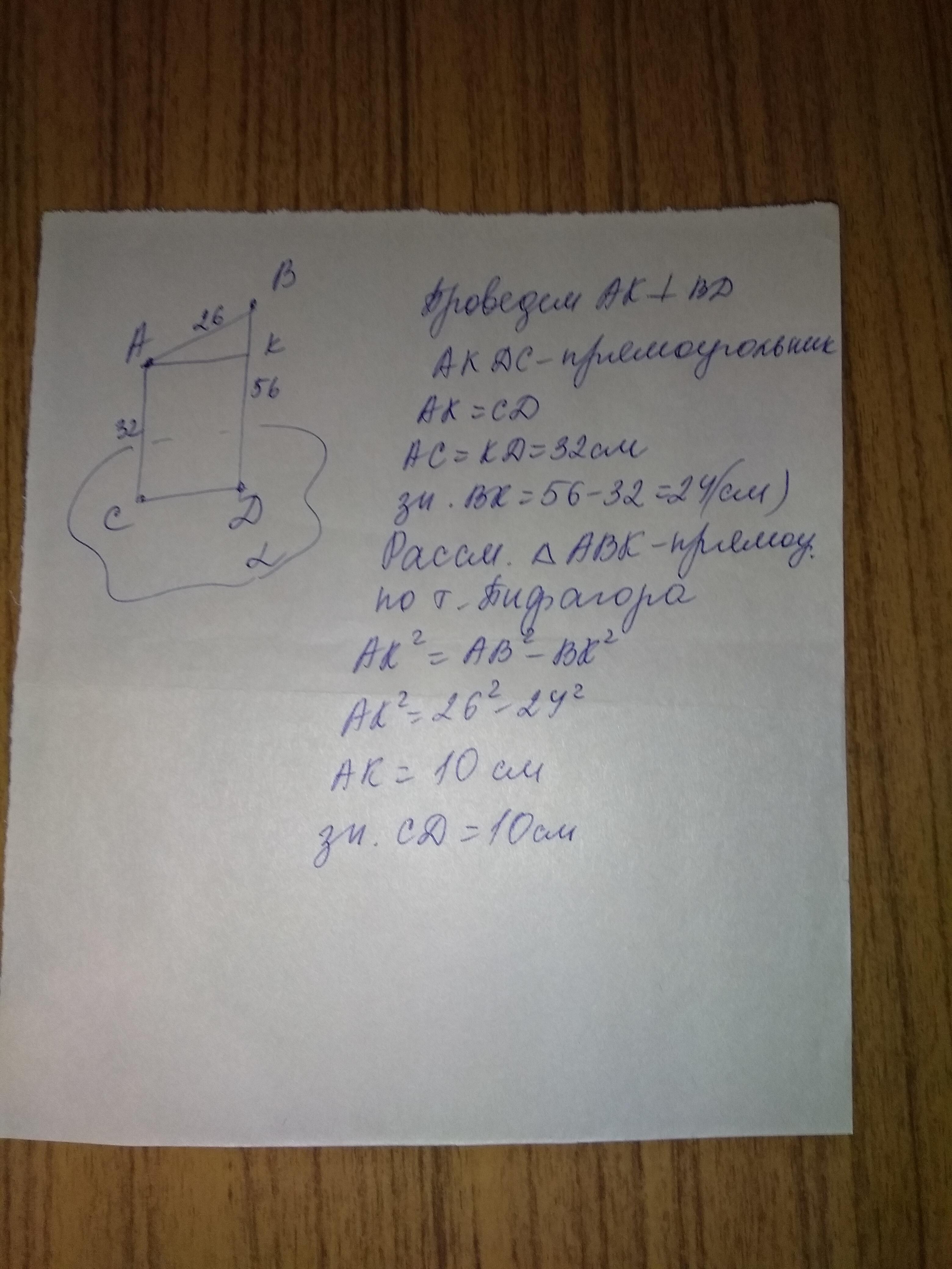 СРОЧНО! через точки а и б проведены прямые перпендикулярные плоскости альфа и пересекающие ее в точках с и д соответственно,найдите расстояние между точками с и д, если ас=32 бд =56 аб=26 и отрезок аб не пересекает плоскость альфа.