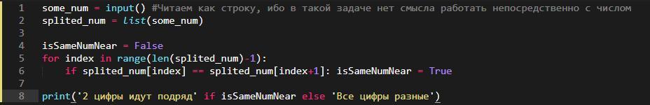 print('2 цифры идут подряд' if isSameNumNear else 'Все цифры разные')