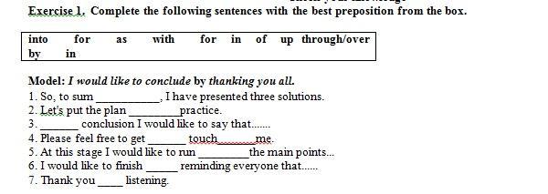 Exercise 1. Complete the following sentences with the best preposition from the box.