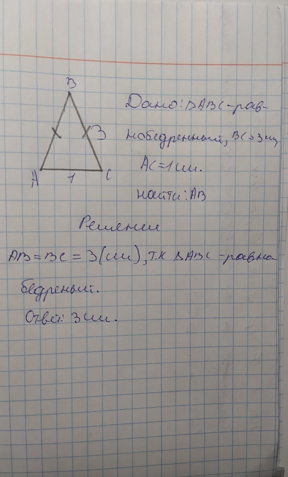 у равнобедренного треуголька рёбра равны,в данном случае—АВ=ВС=3(см)
