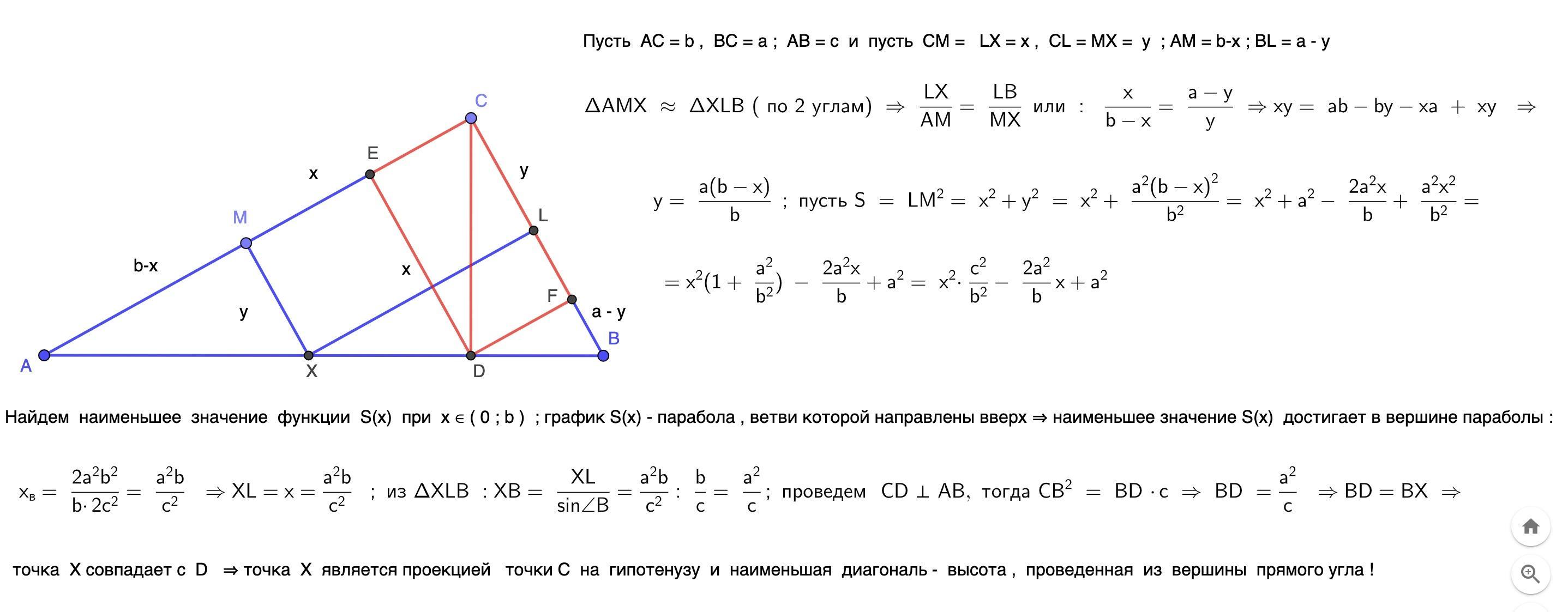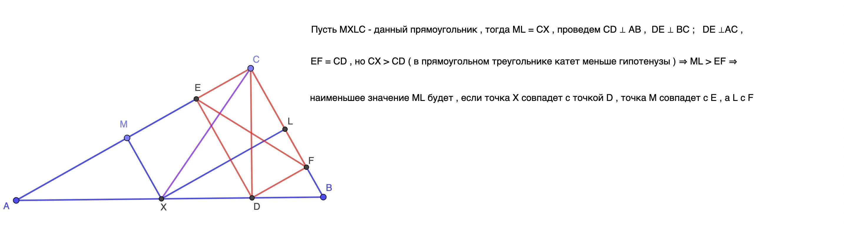 У прямокутний трикутник ABC з прямим кутом С вписуються усі можливі прямокутники CLXM, вершини L, X, M яких лежать на сторонах. Визначте, при якому положенні точки X довжина відрізка LM буде найменшою.