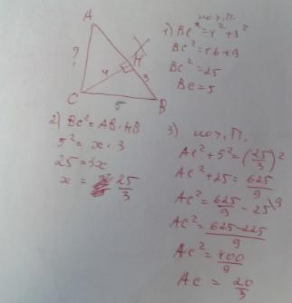 В прямоугольном треугольнике ABC проведена высота CH к гипотенузе. CH=4см, BH=3 см. Найти катет AC.