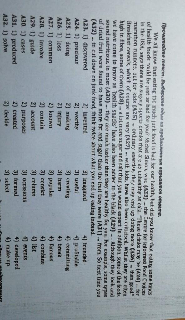 We all know that eating too much junk food is bad for our health, but did you know that eating some kinds of health foods could be just as bad for you? Michel Simon, who (A23) 4) founded the Centre for Informed Food Choices in the USA, says there are sugary sports drinks that are as unhealthy as cola. "These drinks may be (A24) 3) useful for marathon runners, but for kids (A25) 1) doing ordinary exercise, they may end up doing more (A26) 3) harm than good." Breakfast cereals, which of course are very (A27) 3) popular with kids, have also been criticised. Whilst they are often high in fibre, some of them (A28) 2) contain a lot more sugar and salt than you would expect. In addition, some of the foods
