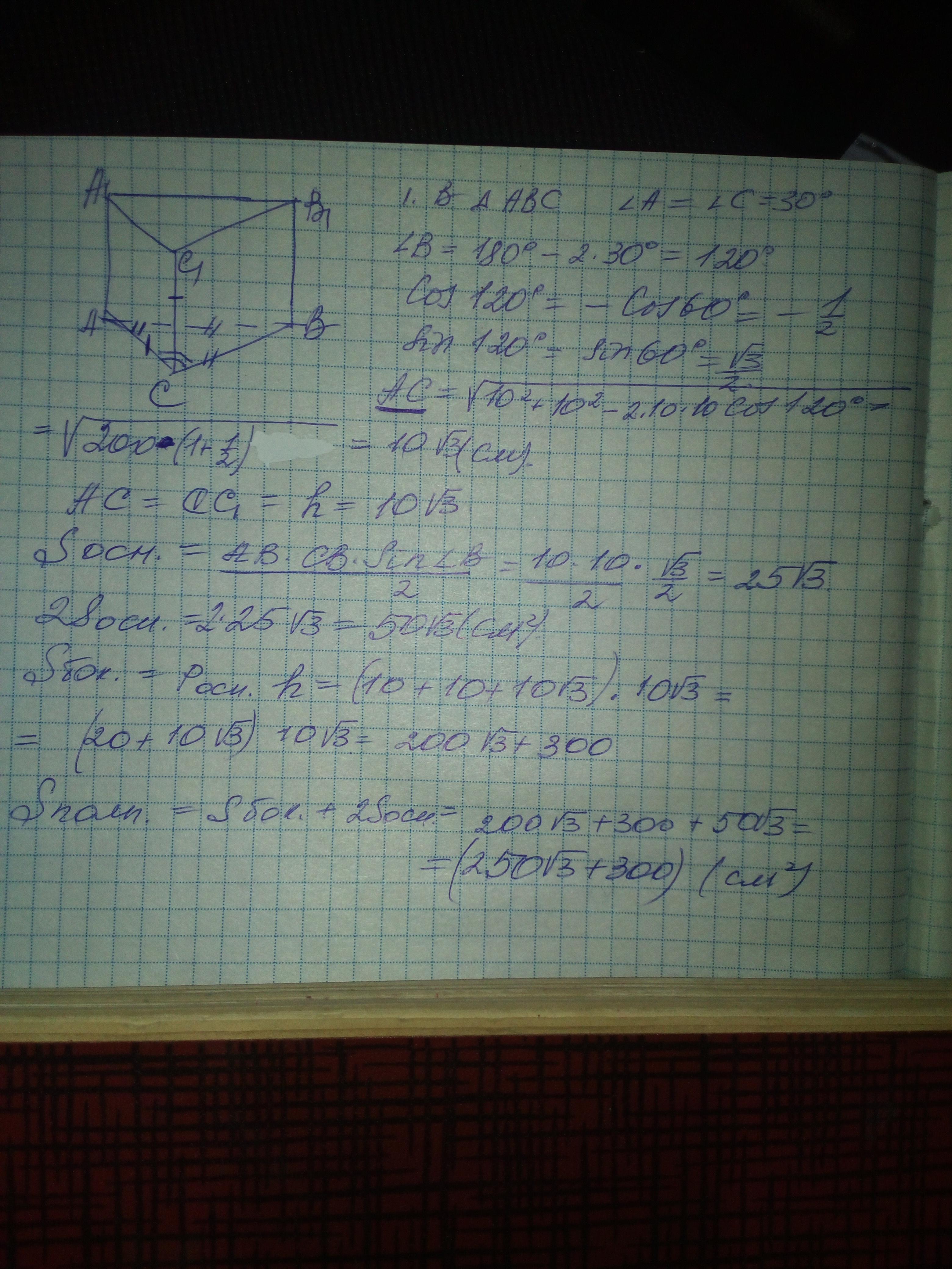 Основанием прямой призмы - равнобедренный треугольник с боковой стороной 10 см и углом при основании 30°. Найдите полную поверхность призмы, если одна ее боковая грань - квадрат.