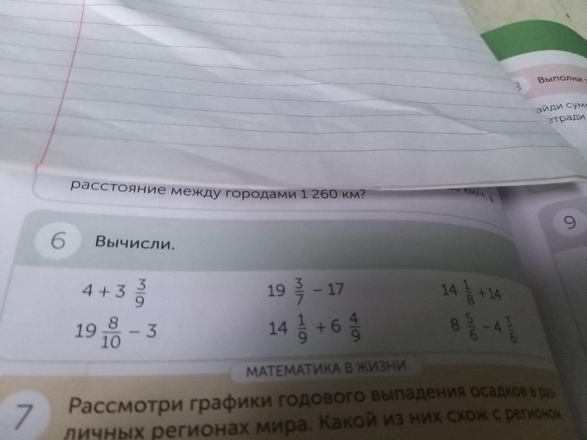 6.вычисли. дроби 4+3 3/9; 19 8/10-3; 19 3/7-17; 14 1/9+6 4/9; 14 1/8+14; 8 5/6-4 3/6
