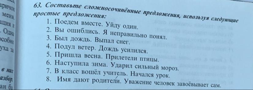 1. Мы не поедем вместе, а именно я уйду один. 2. Вы ошиблись или я неправильно понял. 3. На улице был дождь и недавно выпал снег. 4. За окном подул ветер, а дождь усилился. 5. Пришла весна, и прилетели птицы. 6. Наступила зима, вдобавок ударил сильный мороз. 7. В класс вошёл учитель и начался урок. 8. Имя дают родители, но уважение человек завоёвывает сам.