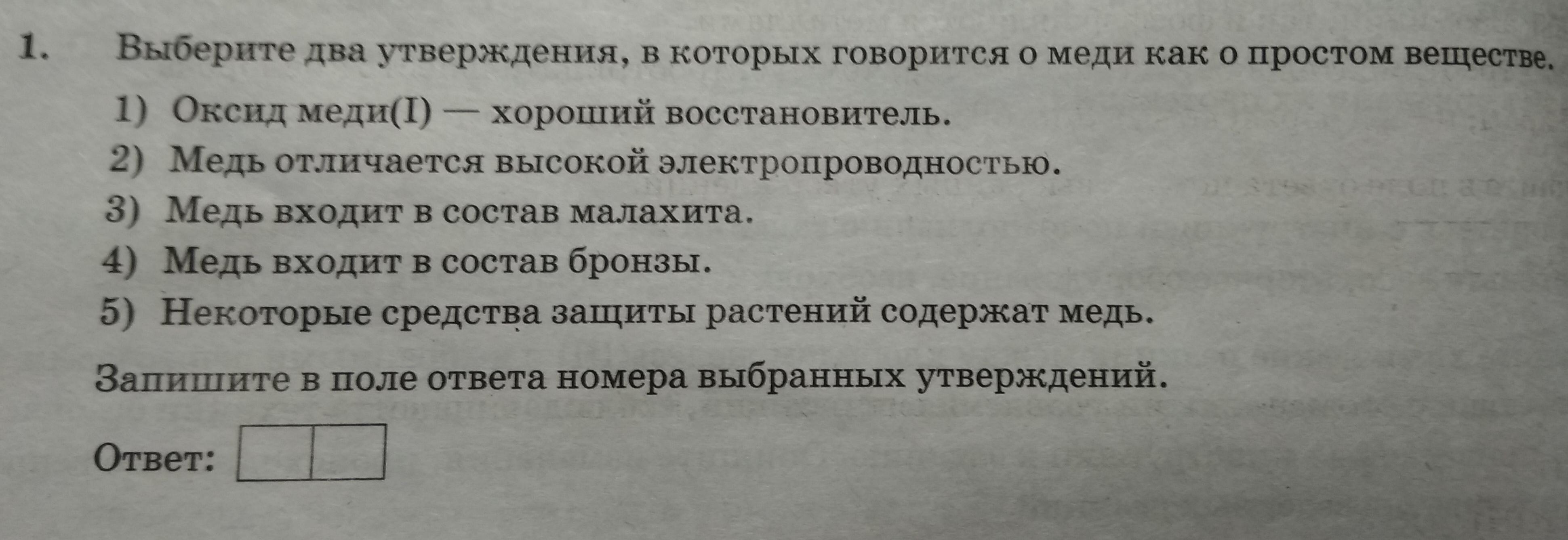 номер 1 не подходит, так как оксид меди - это сложное вещество. Номер 3 не подходит, так как медь входит в состав хим формулы, значит, в данном случае говорим о хим элементе. Номер 5 аналогично с 3-тьим.